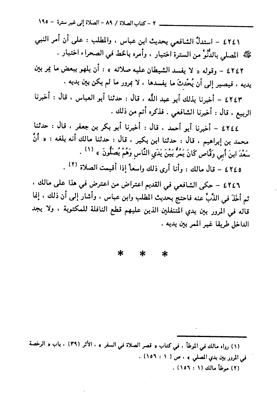 4246 - حَكَى الشَّافِعِيُّ فِي الْقَدِيمِ اعْتَرَاضَ مَنِ اعْتَرَضَ فِي هَذَا عَلَى مَالِكٍ، ثُمَّ أَخَذَ فِي الذَّبِّ عَنْهُ، فَاحْتَجَّ بِحَدِيثِ الْمُطَّلِبِ، وَابْنِ عَبَّاسٍ، وَأَشَارَ إِلَى أَنَّ ذَلِكَ، إِنَّمَا قَالَهُ فِي الْمُرُورِ بَيْنَ يَدَيِ الْمُتَنَفِّلِينَ الَّذِينَ عَلَيْهِمْ قَطْعُ النَّافِلَةِ للمَكْتُوبَةِ، وَلَا يَجِدُ الدَّاخِلُ طَرِيقًا، غَيْرَ الْمَمَرِّ بَيْنَ يَدَيْهِ