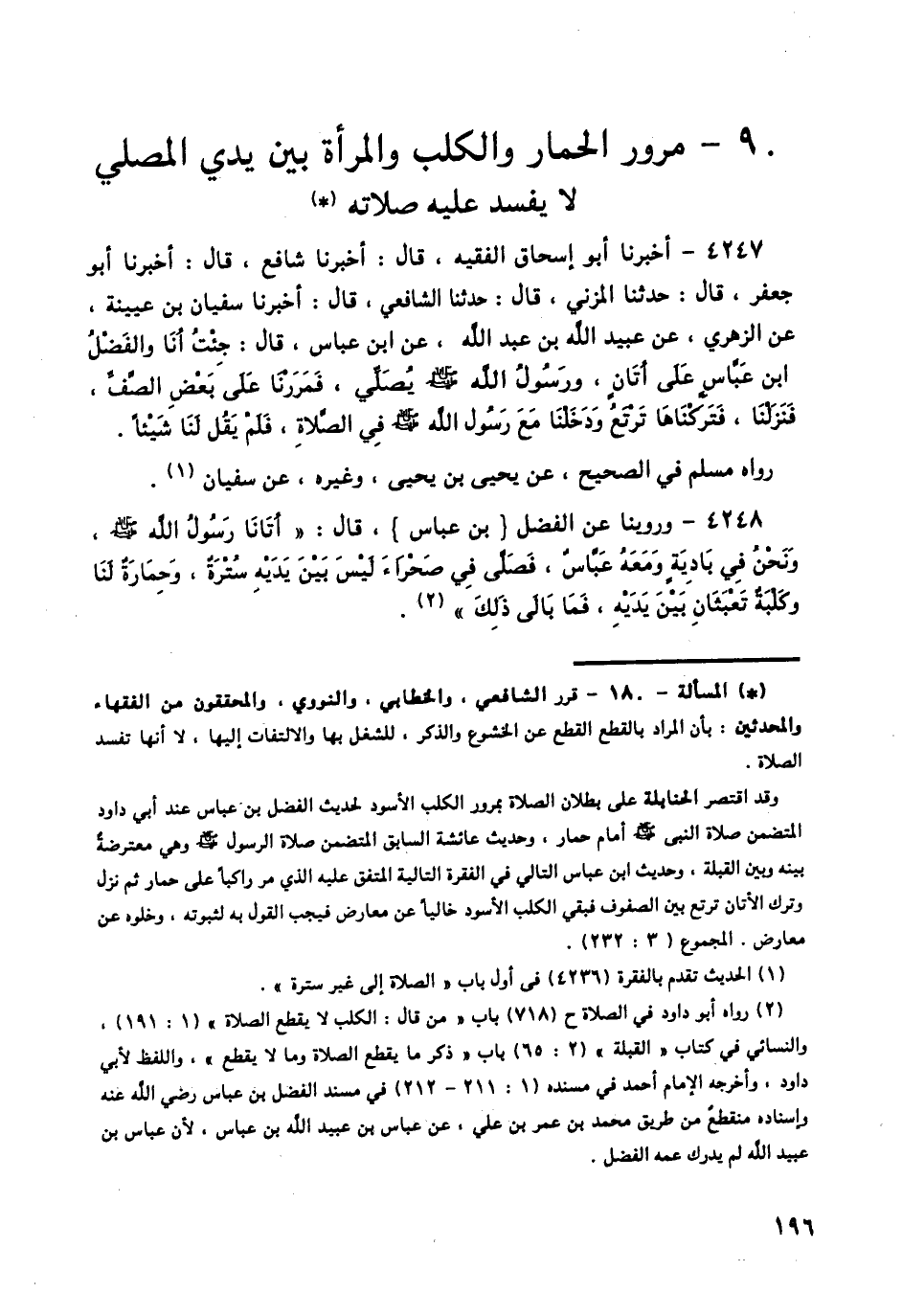 4247 - أَخْبَرَنَا أَبُو إِسْحَاقَ الْفَقِيهُ قَالَ: أَخْبَرَنَا شَافِعٌ قَالَ: أَخْبَرَنَا أَبُو جَعْفَرٍ قَالَ: حَدَّثَنَا الْمُزَنِيُّ قَالَ: حَدَّثَنَا الشَّافِعِيُّ قَالَ: أَخْبَرَنَا سُفْيَانُ بْنُ عُيَيْنَةَ، عَنِ الزُّهْرِيِّ، عَنْ عُبَيْدِ اللَّهِ بْنِ عَبْدِ اللَّهِ، عَنِ ابْنِ عَبَّاسٍ قَالَ: «جِئْتُ أَنَا وَالْفَضْلُ بْنُ عَبَّاسٍ، عَلَى أَتَانٍ، وَرَسُولُ اللَّهِ صَلَّى اللهُ عَلَيْهِ وَسَلَّمَ يُصَلِّي، §فَمَرَرْنَا عَلَى بَعْضِ الصَّفِّ، فَنَزَلْنَا، فَتَرَكْنَاهَا تَرْتَعُ، وَدَخَلْنَا مَعَ رَسُولِ اللَّهِ صَلَّى اللهُ عَلَيْهِ وَسَلَّمَ فِي الصَّلَاةِ، فَلَمْ يَقُلْ لَنَا شَيْئًا» رَوَاهُ مُسْلِمٌ فِي الصَّحِيحِ، عَنْ يَحْيَى بْنِ يَحْيَى، وَغَيْرِهِ، عَنْ سُفْيَانَ