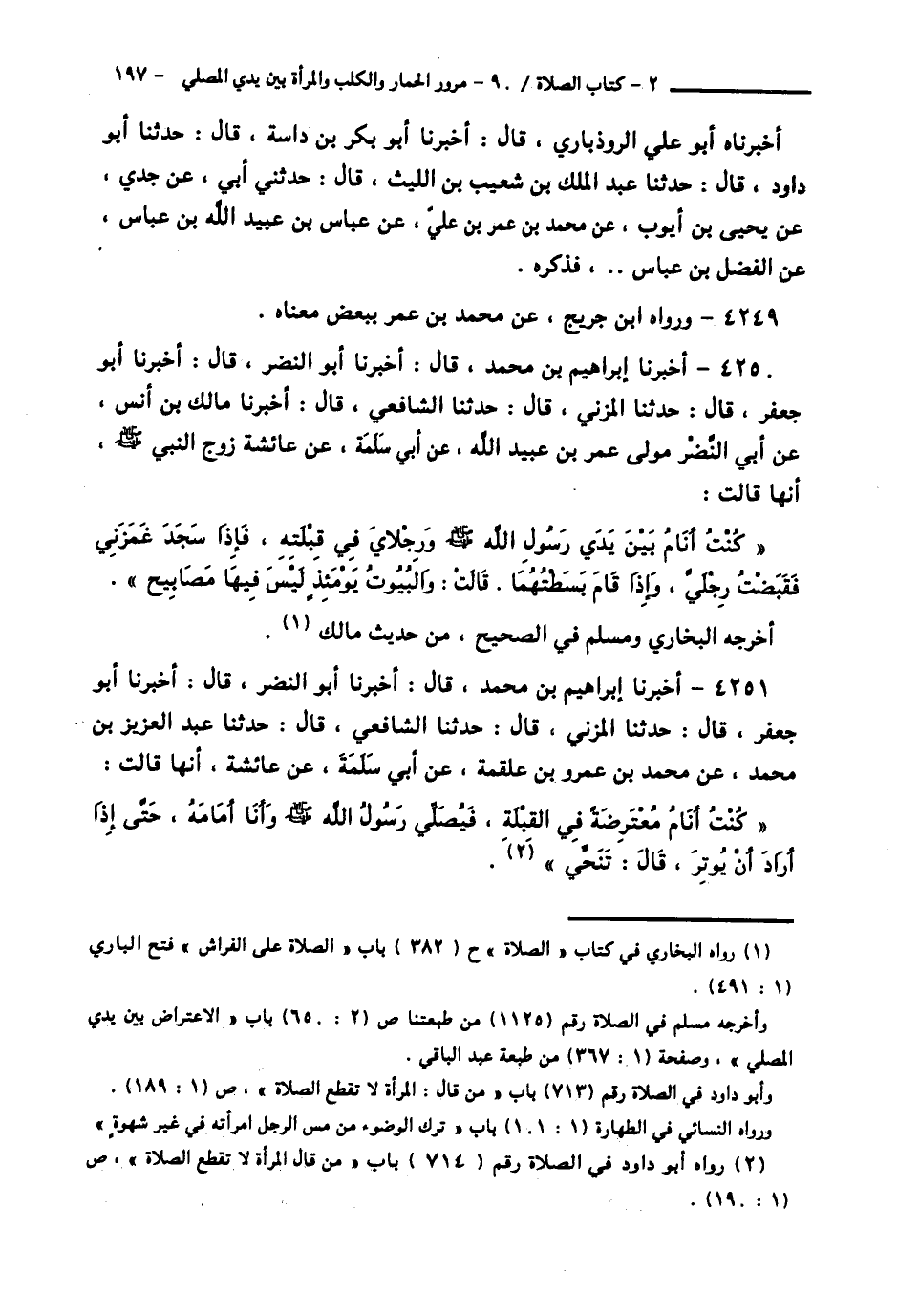 4250 - أَخْبَرَنَا إِبْرَاهِيمُ بْنُ مُحَمَّدٍ قَالَ: أَخْبَرَنَا أَبُو النَّضْرِ قَالَ: أَخْبَرَنَا أَبُو جَعْفَرٍ قَالَ: حَدَّثَنَا الْمُزَنِيُّ، قَالَ: حَدَّثَنَا الشَّافِعِيُّ قَالَ: أَخْبَرَنَا مَالِكُ بْنُ أَنَسٍ، عَنْ أَبِي النَّضْرِ، مَوْلَى عُمَرَ بْنِ عُبَيْدِ اللَّهِ، عَنْ أَبِي سَلَمَةَ، عَنْ عَائِشَةَ، زَوْجِ النَّبِيِّ صَلَّى اللهُ عَلَيْهِ وَسَلَّمَ، أَنَّهَا قَالَتْ: «كُنْتُ §أَنَامُ بَيْنَ يَدَيْ رَسُولِ اللَّهِ صَلَّى اللهُ عَلَيْهِ وَسَلَّمَ، وَرِجْلَايَ فِي قِبْلَتِهِ، فَإِذَا سَجَدَ غَمَزَنِي، فَقَبَضْتُ رِجْلَيَّ، وَإِذَا قَامَ بَسَطْتُهُمَا» قَالَتْ: «وَالْبُيُوتُ يَوْمَئِذٍ، لَيْسَ فِيهَا مَصَابِيحُ» أَخْرَجَهُ الْبُخَارِيُّ، وَمُسْلِمٌ فِي الصَّحِيحِ، مِنْ حَدِيثِ مَالِكٍ