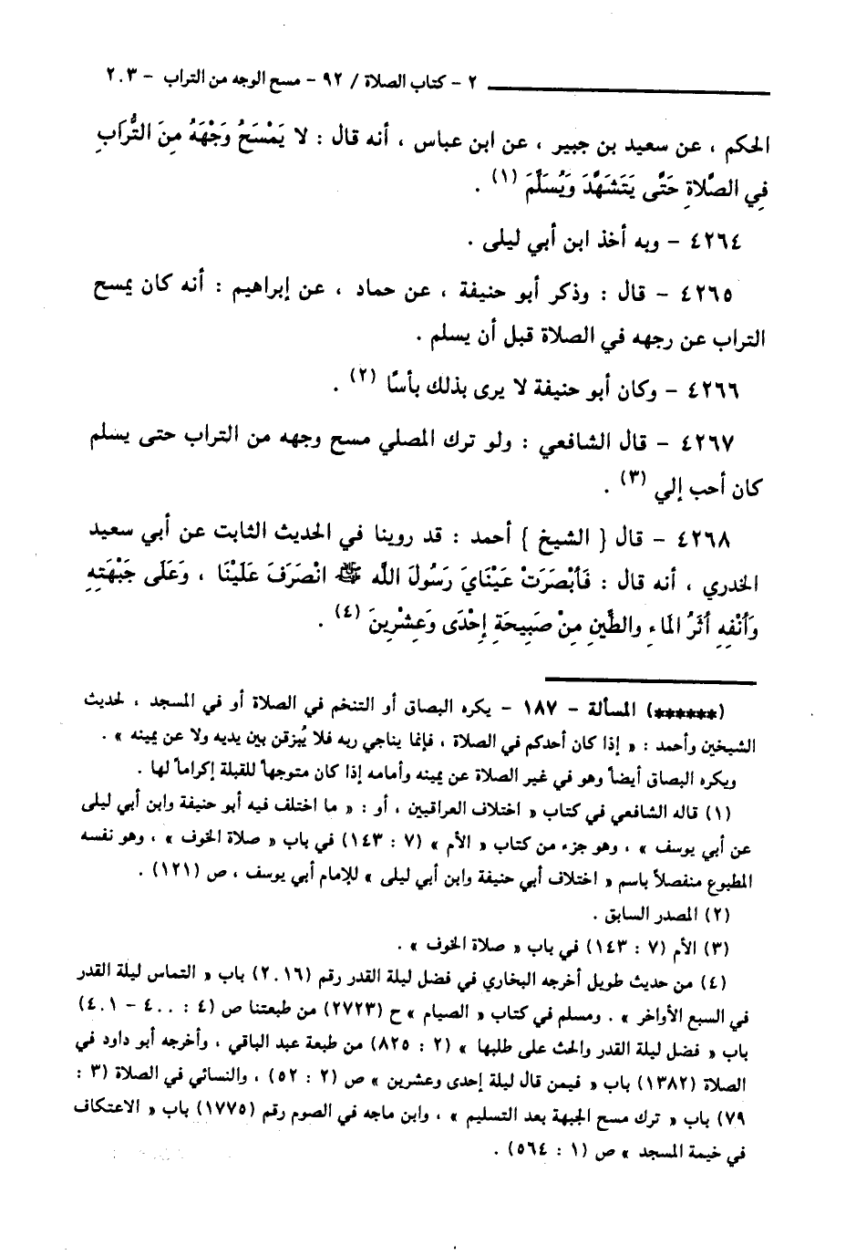 4269 - وَكَانَ الْحُمَيْدِيُّ يَحْتَجُّ بِهَذَا فِي أَنْ لَا يَمْسَحَ الْمُصَلِّي الْجَبْهَةَ فِي الصَّلَاةِ