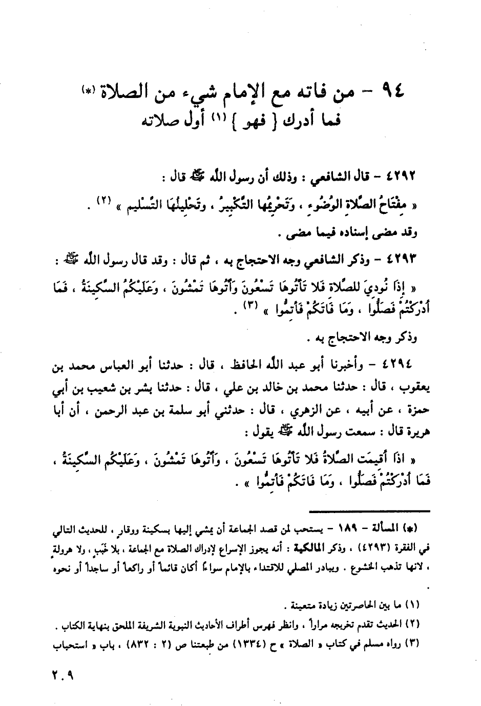 4293 - وَذَكَرَ الشَّافِعِيُّ وَجْهَ الِاحْتِجَاجِ بِهِ، ثُمَّ قَالَ: وَقَدْ قَالَ رَسُولُ اللَّهِ صَلَّى اللهُ عَلَيْهِ وَسَلَّمَ: «إِذَا نُودِيَ لِلصَّلَاةِ، فَلَا تَأْتُوهَا تَسْعَوْنَ، وَأْتُوهَا تَمْشُونَ، وَعَلَيْكُمُ السَّكِينَةُ، فَمَا أَدْرَكْتُمْ فَصَلُّوا، وَمَا فَاتَكُمْ فَأَتِمُّوا»، وَذَكَرَ وَجْهَ الِاحْتِجَاجِ بِهِ.