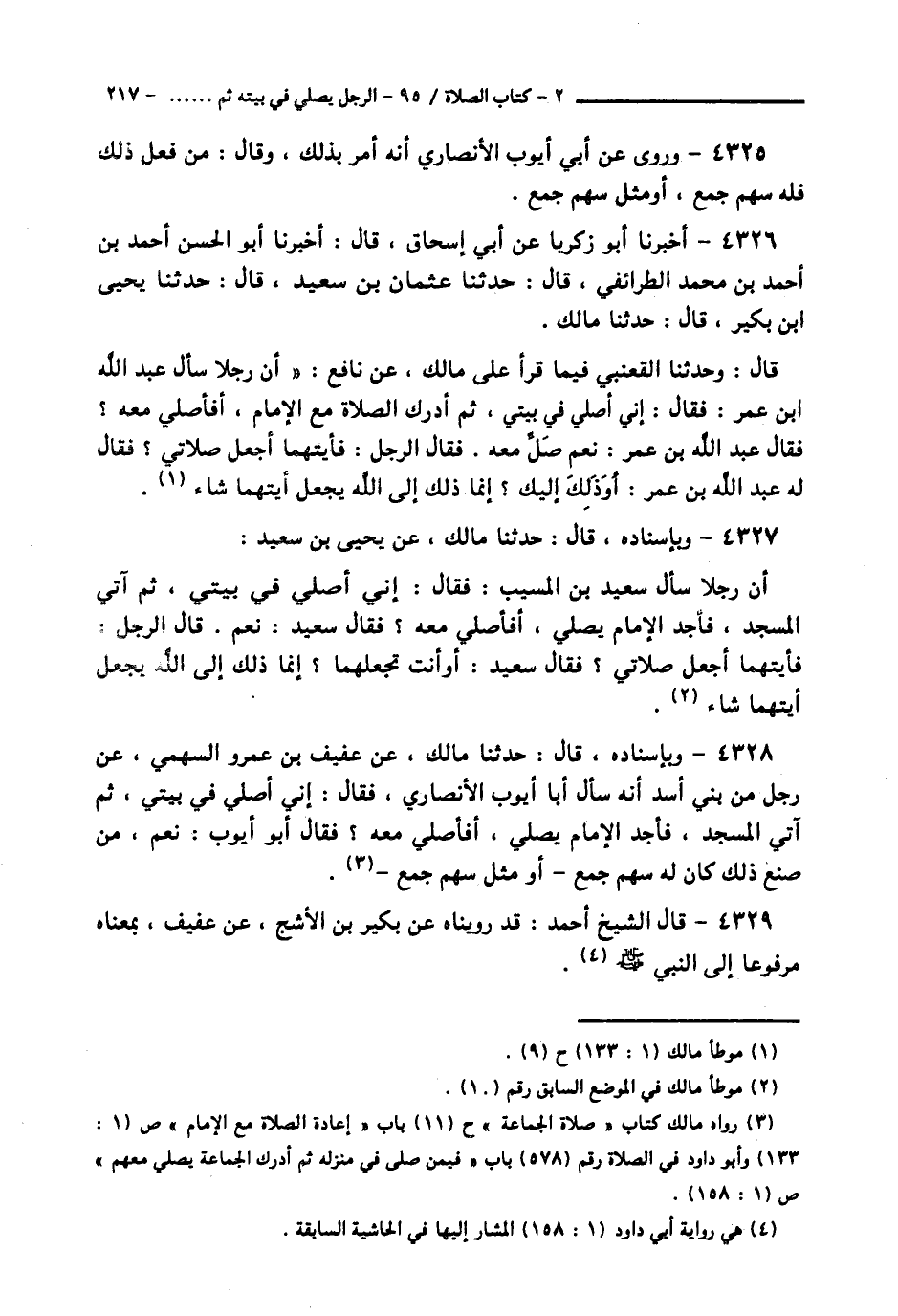 4326 - أَخْبَرَنَا أَبُو زَكَرِيَّا، عَنْ أَبِي إِسْحَاقَ قَالَ: أَخْبَرَنَا أَبُو الْحَسَنِ أَحْمَدُ بْنُ أَحْمَدَ بْنِ مُحَمَّدٍ الطَّرَائِفِيُّ قَالَ: حَدَّثَنَا عُثْمَانُ بْنُ سَعِيدٍ قَالَ: حَدَّثَنَا يَحْيَى بْنُ بُكَيْرٍ قَالَ: حَدَّثَنَا مَالِكٌ قَالَ: وَحَدَّثَنَا الْقَعْنَبِيُّ، فِيمَا قَرَأَ عَلَى مَالِكٍ، عَنْ نَافِعٍ، أَنَّ رَجُلًا، سَأَلَ عَبْدَ اللَّهِ بْنَ عُمَرَ، فَقَالَ: إِنِّي §أُصَلِّي فِي بَيْتِي، ثُمَّ أُدْرِكُ الصَّلَاةَ مَعَ الْإِمَامِ، أَفَأُصَلِّيَ مَعَهُ؟ فَقَالَ عَبْدُ اللَّهِ بْنُ عُمَرَ: «نَعَمْ صَلِّ مَعَهُ». فَقَالَ الرَّجُلُ: فَأَيَّتُهُمَا أَجْعَلُ صَلَاتِي؟ فَقَالَ لَهُ عَبْدُ اللَّهِ بْنُ عُمَرَ: «أَوَذَلِكَ إِلَيْكَ؟ إِنَّمَا ذَلِكَ إِلَى اللَّهِ، يَجْعَلُ أَيَّتَهُمَا شَاءَ»