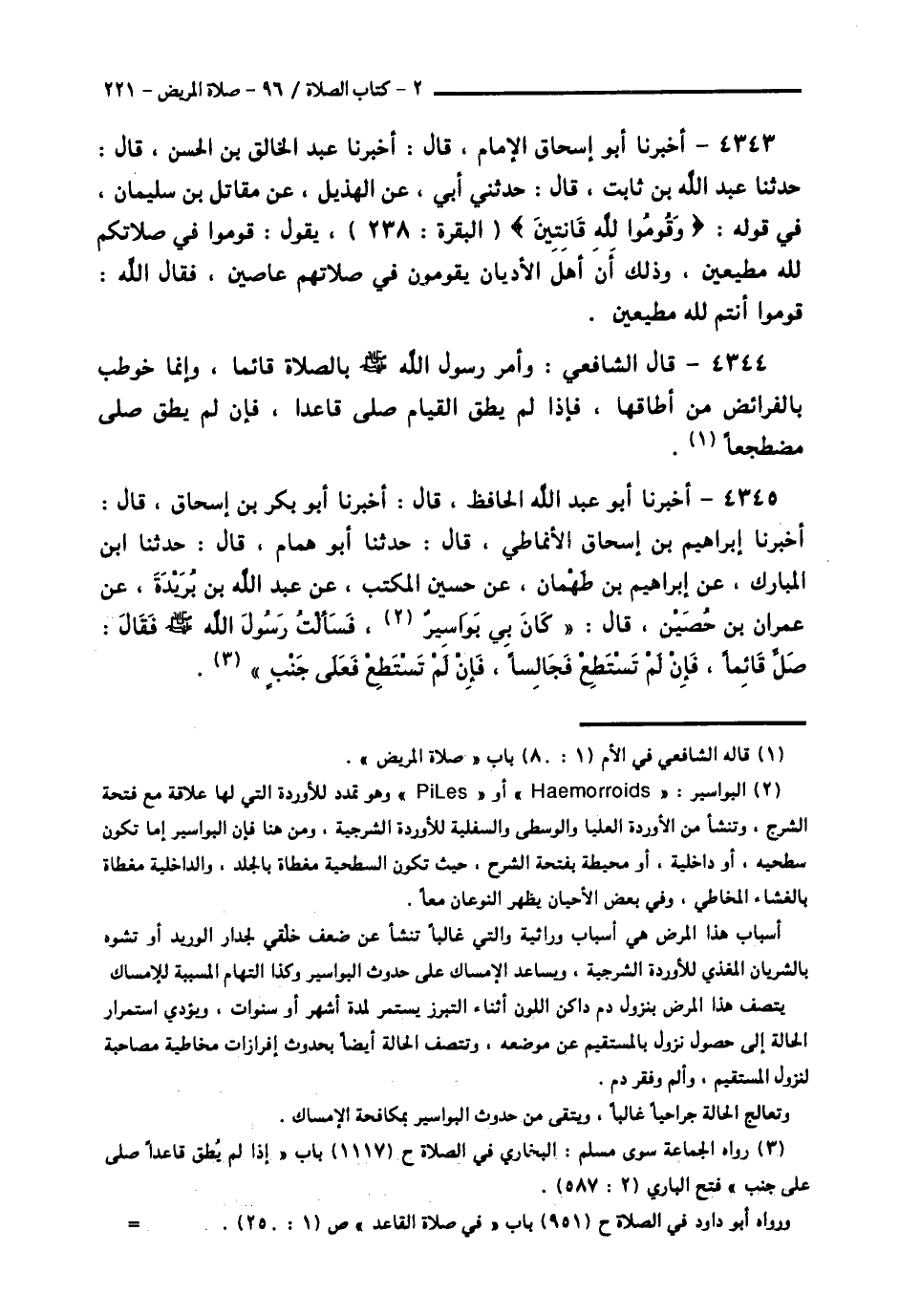 4345 - أَخْبَرَنَا أَبُو عَبْدِ اللَّهِ الْحَافِظُ قَالَ: أَخْبَرَنَا أَبُو بَكْرِ بْنُ إِسْحَاقَ قَالَ: أَخْبَرَنَا إِبْرَاهِيمُ بْنُ إِسْحَاقَ الْأَنْمَاطِيُّ قَالَ: حَدَّثَنَا أَبُو هَمَّامٍ قَالَ: حَدَّثَنَا ابْنُ الْمُبَارَكِ عَنْ إِبْرَاهِيمَ بْنِ طَهْمَانَ، عَنْ حُسَيْنٍ الْمُكْتِبِ، عَنْ عَبْدِ اللَّهِ بْنِ بُرَيْدَةَ، عَنْ عِمْرَانَ بْنِ حُصَيْنٍ قَالَ: كَانَ بِي بَوَاسِيرُ، فَسَأَلْتُ رَسُولَ اللَّهِ صَلَّى اللهُ عَلَيْهِ وَسَلَّمَ، فَقَالَ: «§صَلِّ قَائِمًا، فَإِنْ لَمْ تَسْتَطِعْ فَجَالِسًا، فَإِنْ لَمْ تَسْتَطِعْ فَعَلَى جَنْبٍ» -[222]-، رَوَاهُ الْبُخَارِيُّ فِي الصَّحِيحِ، عَنْ عَبْدَانَ، عَنْ عَبْدِ اللَّهِ بْنِ الْمُبَارَكِ
