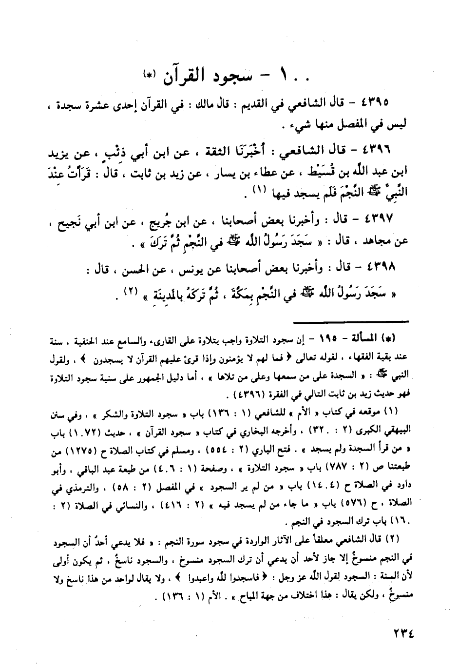 4396 - قَالَ الشَّافِعِيُّ: أَخْبَرَنَا الثِّقَةُ، عَنِ ابْنِ أَبِي ذِئْبٍ، عَنْ يَزِيدَ بْنِ عَبْدِ اللَّهِ بْنِ قُسَيْطٍ، عَنْ عَطَاءِ بْنِ يَسَارٍ، عَنْ زَيْدِ بْنِ ثَابِتٍ قَالَ: «§قَرَأْتُ عِنْدَ النَّبِيِّ صَلَّى اللهُ عَلَيْهِ وَسَلَّمَ النَّجْمَ، فَلَمْ يَسْجُدْ فِيهَا»