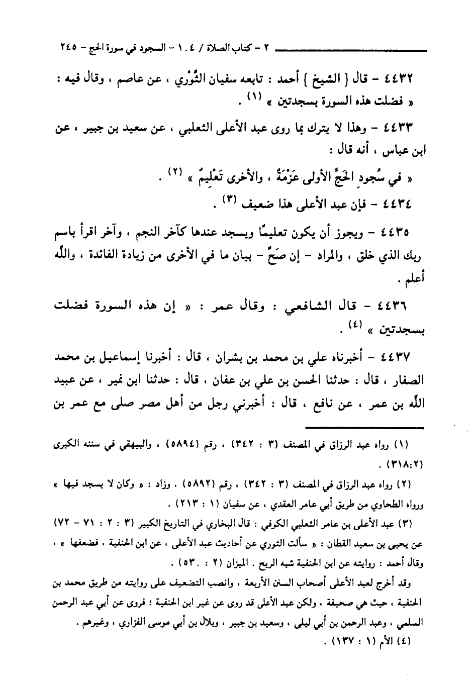 4437 - أَخْبَرَنَاهُ عَلِيُّ بْنُ مُحَمَّدِ بْنِ بِشْرَانَ قَالَ: أَخْبَرَنَا إِسْمَاعِيلُ بْنُ مُحَمَّدٍ الصَّفَّارُ قَالَ: حَدَّثَنَا الْحَسَنُ بْنُ عَلِيِّ بْنِ عَفَّانَ قَالَ: حَدَّثَنَا ابْنُ نُمَيْرٍ، عَنْ عُبَيْدِ اللَّهِ بْنِ عُمَرَ، عَنْ نَافِعٍ قَالَ: أَخْبَرَنِي رَجُلٌ مِنْ أَهْلِ مِصْرَ صَلَّى مَعَ عُمَرَ بْنِ -[246]- الْخَطَّابِ الْفَجْرَ، بِالْجَابِيَةِ: «§فَقَرَأَ السُّورَةَ الَّتِي يَذْكُرُ فِيهَا الْحَجَّ، فَسَجَدَ فِيهَا سَجْدَتَيْنِ» قَالَ نَافِعٌ: فَلَمَّا انْصَرَفَ قَالَ: «إِنَّ هَذِهِ السُّورَةَ فُضِّلَتْ بِأَنَّ فِيهَا سَجْدَتَيْنِ، وَكَانَ ابْنُ عُمَرَ يَسْجُدُ فِيهَا سَجْدَتَيْنِ»