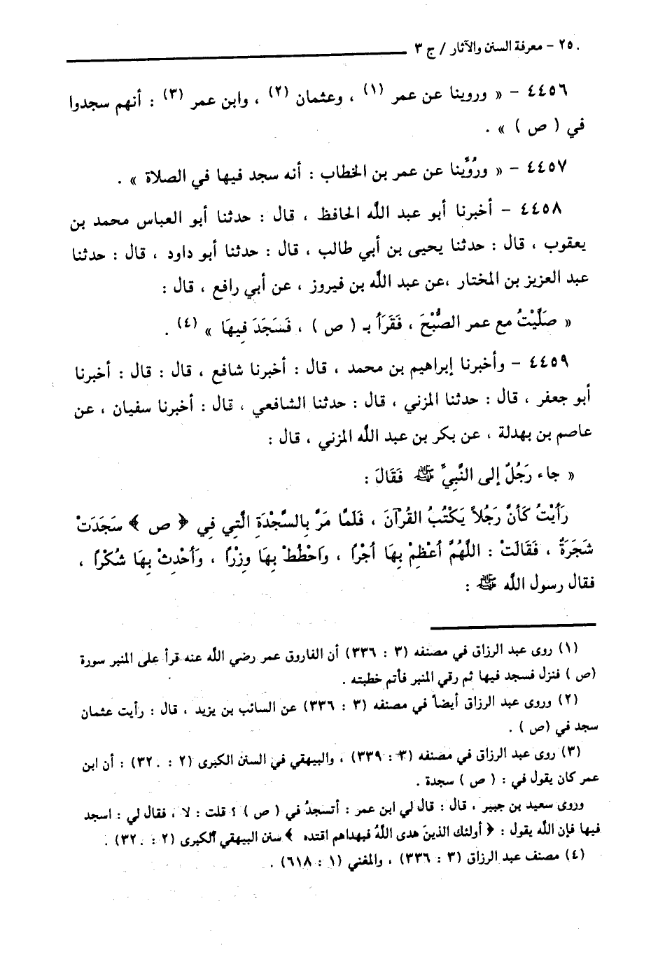 4459 - وَأَخْبَرَنَا إِبْرَاهِيمُ بْنُ مُحَمَّدٍ قَالَ: أَخْبَرَنَا شَافِعٌ قَالَ: قَالَ: أَخْبَرَنَا أَبُو جَعْفَرٍ قَالَ: حَدَّثَنَا الْمُزَنِيُّ قَالَ: حَدَّثَنَا الشَّافِعِيُّ قَالَ: أَخْبَرَنَا سُفْيَانُ، عَنْ عَاصِمِ ابْنِ بَهْدَلَةَ، عَنْ بَكْرِ بْنِ عَبْدِ اللَّهِ الْمُزَنِيِّ قَالَ: جَاءَ رَجُلٌ إِلَى النَّبِيِّ صَلَّى اللهُ عَلَيْهِ وَسَلَّمَ، فَقَالَ: رَأَيْتُ كَأَنَّ رَجُلًا يَكْتُبُ الْقُرْآنَ، فَلَمَّا مَرَّ بِالسَّجْدَةِ الَّتِي فِي ص، سَجَدَتْ شَجَرَةٌ، فَقَالَتِ: اللَّهُمَّ أَعْظِمْ بِهَا أَجْرًا، وَاحْطُطْ بِهَا وِزْرًا، وَأَحْدِثْ بِهَا شُكْرًا، فَقَالَ رَسُولُ اللَّهِ صَلَّى اللهُ عَلَيْهِ وَسَلَّمَ -[251]-: «§نَحْنُ أَحَقُّ بِالسُّجُودِ، مِنَ الشَّجَرَةِ» فَسَجَدَهَا، وَأَمَرَ بِالسُّجُودِ،