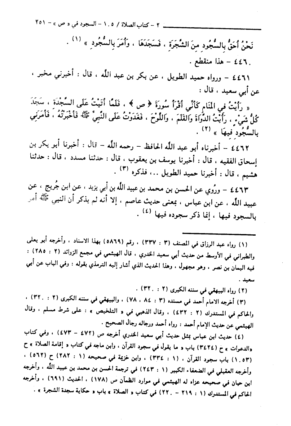 4461 - وَرَوَاهُ حُمَيْدٌ الطَّوِيلُ عَنْ بَكْرِ بْنِ عَبْدِ اللَّهِ قَالَ: أَخْبَرَنِي مُخْبِرٌ، عَنْ أَبِي سَعِيدٍ قَالَ: «رَأَيْتُ فِيَ الْمَنَامِ كَأَنِّي أَقْرَأُ سُورَةَ ص، فَلَمَّا أَتَيْتُ عَلَى السَّجْدَةِ سَجَدَ كُلُّ شَيْءٍ، رَأَيْتُ الدَّوَاةَ، وَالْقَلَمَ، وَاللَّوْحَ، فَغَدَوْتُ عَلَى النَّبِيِّ صَلَّى اللهُ عَلَيْهِ وَسَلَّمَ، فَأَخْبَرْتُهُ، §فَأَمَرَنِي بِالسُّجُودِ فِيهَا»،