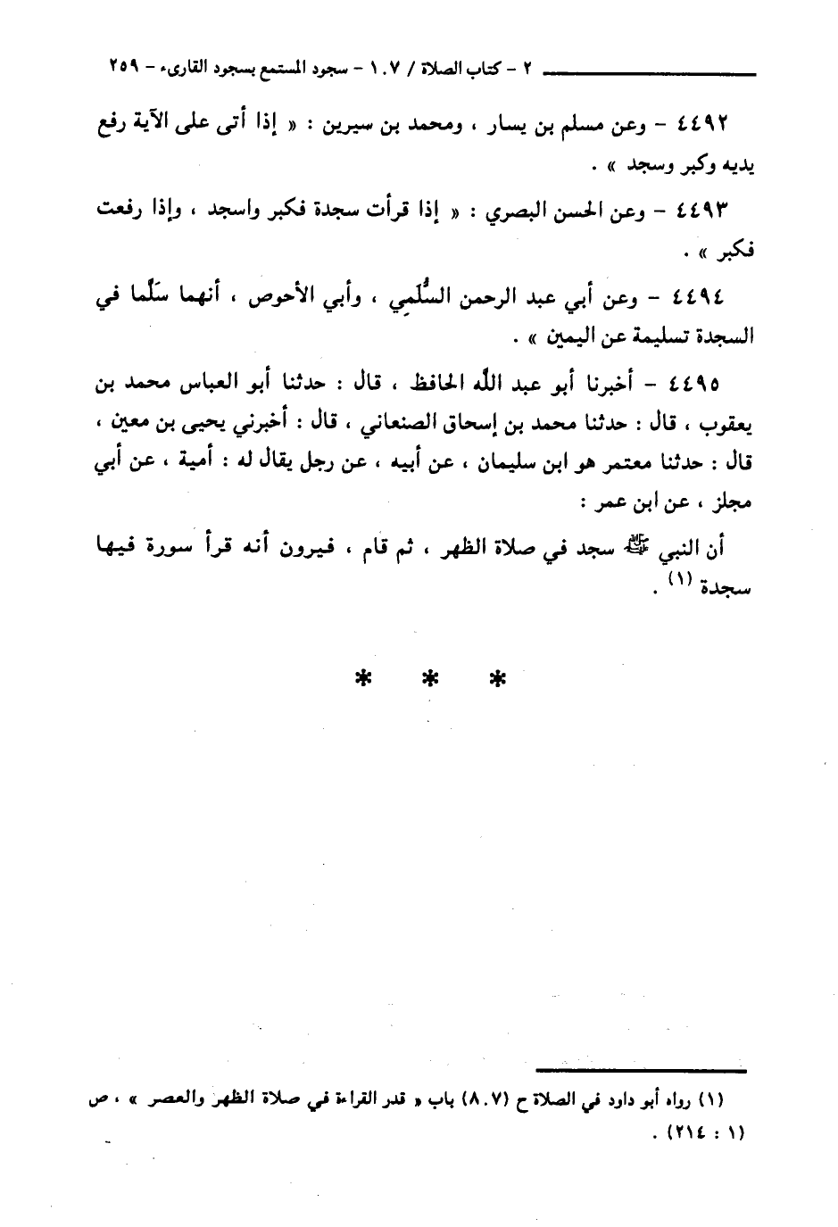 4495 - أَخْبَرَنَا أَبُو عَبْدِ اللَّهِ الْحَافِظُ قَالَ: حَدَّثَنَا أَبُو الْعَبَّاسِ مُحَمَّدُ بْنُ يَعْقُوبَ قَالَ: حَدَّثَنَا مُحَمَّدُ بْنُ إِسْحَاقَ الصَّغَانِيُّ قَالَ: أَخْبَرَنِي يَحْيَى بْنُ مَعِينٍ قَالَ: حَدَّثَنَا مُعْتَمِرٌ هُوَ ابْنُ سُلَيْمَانَ عَنْ أَبِيهِ، عَنْ رَجُلٍ يُقَالُ لَهُ: أُمَيَّةُ عَنْ أَبِي مِجْلَزٍ، عَنِ ابْنِ عُمَرَ: أَنَّ النَّبِيَّ صَلَّى اللهُ عَلَيْهِ وَسَلَّمَ، «§سَجَدَ فِي صَلَاةِ الظُّهْرِ، ثُمَّ قَامَ، فَيَرَوْنَ أَنَّهُ قَرَأَ سُورَةً فِيهَا سَجْدَةٌ»