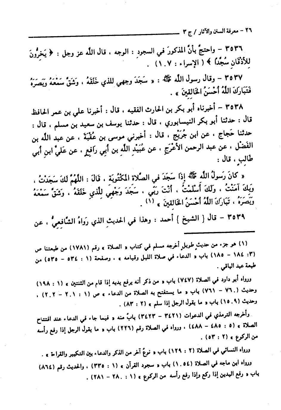 3538 - أَخْبَرَنَاهُ أَبُو بَكْرِ بْنُ الْحَارِثِ الْفَقِيهُ قَالَ: أَخْبَرَنَا عَلِيُّ بْنُ عُمَرَ الْحَافِظُ قَالَ: حَدَّثَنَا أَبُو بَكْرٍ النَّيْسَابُورِيُّ قَالَ: حَدَّثَنَا يُوسُفُ بْنُ سَعِيدِ بْنِ مُسْلِمٍ قَالَ: حَدَّثَنَا حَجَّاجٌ، عَنِ ابْنِ جُرَيْجٍ قَالَ: أَخْبَرَنِي مُوسَى بْنُ عُقْبَةَ، عَنْ عَبْدِ اللَّهِ بْنِ الْفَضْلِ، عَنْ عَبْدِ الرَّحْمَنِ الْأَعْرَجِ، عَنْ عُبَيْدِ اللَّهِ بْنِ أَبِي رَافِعٍ، عَنْ عَلِيِّ بْنِ أَبِي طَالِبٍ قَالَ: كَانَ رَسُولُ اللَّهِ صَلَّى اللهُ عَلَيْهِ وَسَلَّمَ، إِذَا سَجَدَ فِي الصَّلَاةِ الْمَكْتُوبَةِ قَالَ: «§اللَّهُمَّ لَكَ سَجَدْتُ، وَبِكَ آمَنْتُ، وَلَكَ أَسْلَمْتُ، أَنْتَ رَبِّي، سَجَدَ وَجْهِي لِلَّذِي خَلَقَهُ، وَشَقَّ سَمْعَهُ وَبَصَرَهُ، تَبَارَكَ اللَّهُ أَحْسَنُ الْخَالِقِينَ»