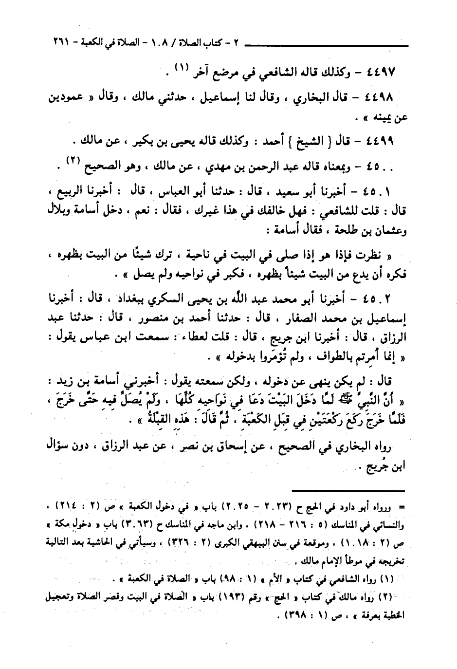 4501 - أَخْبَرَنَا أَبُو سَعِيدٍ قَالَ: حَدَّثَنَا أَبُو الْعَبَّاسِ قَالَ: أَخْبَرَنَا الرَّبِيعُ قَالَ: قُلْتُ لِلشَّافِعِيِّ: فَهَلْ خَالَفَكَ فِي هَذَا غَيْرُكَ، فَقَالَ: نَعَمْ دَخَلَ أُسَامَةُ، وَبِلَالٌ، وَعُثْمَانُ بْنُ طَلْحَةَ، فَقَالَ أُسَامَةُ: «نَظَرْتُ، §فَإِذَا هُوَ إِذَا صَلَّى فِي الْبَيْتِ فِي نَاحِيَةٍ تَرَكَ شَيْئًا مِنَ الْبَيْتِ بِظَهْرِهِ، فَكَرِهَ أَنْ يَدَعَ مِنَ الْبَيْتِ شَيْئًا بِظَهْرِهِ، فَكَبَّرَ فِي نَوَاحِيهِ، وَلَمْ يُصَلِّ»