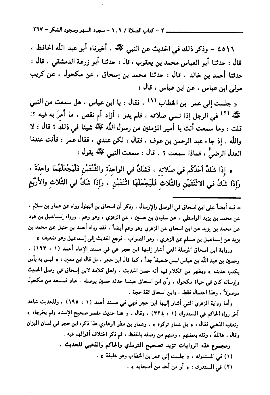 4516 - وَذَكَرَ ذَلِكَ فِي الْحَدِيثِ عَنِ النَّبِيِّ صَلَّى اللهُ عَلَيْهِ وَسَلَّمَ أَخْبَرَنَاهُ أَبُو عَبْدِ اللَّهِ الْحَافِظُ قَالَ: حَدَّثَنَا أَبُو الْعَبَّاسِ مُحَمَّدُ بْنُ يَعْقُوبَ قَالَ: حَدَّثَنَا أَبُو زُرْعَةَ الدِّمَشْقِيُّ قَالَ: حَدَّثَنَا أَحْمَدُ بْنُ خَالِدٍ قَالَ: حَدَّثَنَا مُحَمَّدُ بْنُ إِسْحَاقَ، عَنْ مَكْحُولٍ، عَنْ كُرَيْبٍ، مَوْلَى ابْنِ عَبَّاسٍ، عَنِ ابْنِ عَبَّاسٍ قَالَ: جَلَسْتُ إِلَى عُمَرَ بْنِ الْخَطَّابِ، فَقَالَ: يَا ابْنَ عَبَّاسٍ هَلْ سَمِعْتَ مِنَ النَّبِيِّ صَلَّى اللهُ عَلَيْهِ وَسَلَّمَ فِي الرَّجُلِ إِذَا نَسِيَ صَلَاتَهُ، فَلَمْ يَدْرِ، أَزَادَ، أَمْ نَقَصَ، مَا أَمَرَ بِهِ فِيهِ؟، قُلْتُ: وَمَا سَمِعْتَ أَنْتَ يَا أَمِيرَ الْمُؤْمِنِينَ، مِنْ رَسُولِ اللَّهِ صَلَّى اللهُ عَلَيْهِ وَسَلَّمَ شَيْئًا فِي ذَلِكَ؟ قَالَ: لَا وَاللَّهِ، إِذْ جَاءَ عَبْدُ الرَّحْمَنِ بْنُ عَوْفٍ فَقَالَ: لَكِنْ عِنْدِي، فَقَالَ عُمَرُ: فَأَنْتَ عِنْدَنَا الْعَدْلُ الرَّضِيُّ، فَمَاذَا سَمِعْتَ؟ قَالَ: سَمِعْتُ النَّبِيَّ صَلَّى اللهُ عَلَيْهِ وَسَلَّمَ يَقُولُ: «§إِذَا شَكَّ أَحَدُكُمْ فِي صَلَاتِهِ، فَشَكَّ فِي الْوَاحِدَةِ، وَالثِّنْتَيْنِ فَلْيَجْعَلْهُمَا وَاحِدَةً، وَإِذَا شَكَّ فِي الِاثْنَتَيْنِ، وَالثَّلَاثِ، فَلْيَجْعَلْهُمَا اثْنَتَيْنِ، وَإِذَا شَكَّ فِي الثَّلَاثِ، وَالْأَرْبَعِ -[268]-، فَلْيَجْعَلْهَا ثَلَاثًا، حَتَّى يَكُونَ الْوَهْمُ فِي الزِّيَادَةِ، وَيَسْجُدُ سَجْدَتَيْنِ قَبْلَ أَنْ يُسَلِّمَ، ثُمَّ يُسَلِّمُ» هَكَذَا رَوَاهُ جَمَاعَةٌ، عَنْ مُحَمَّدِ بْنِ إِسْحَاقَ، وَرَوَاهُ عَنْهُ ابْنُ عُلَيَّةَ، عَنْ مَكْحُولٍ، عَنِ ابْنِ عَبَّاسٍ بِمَعْنَاهُ.