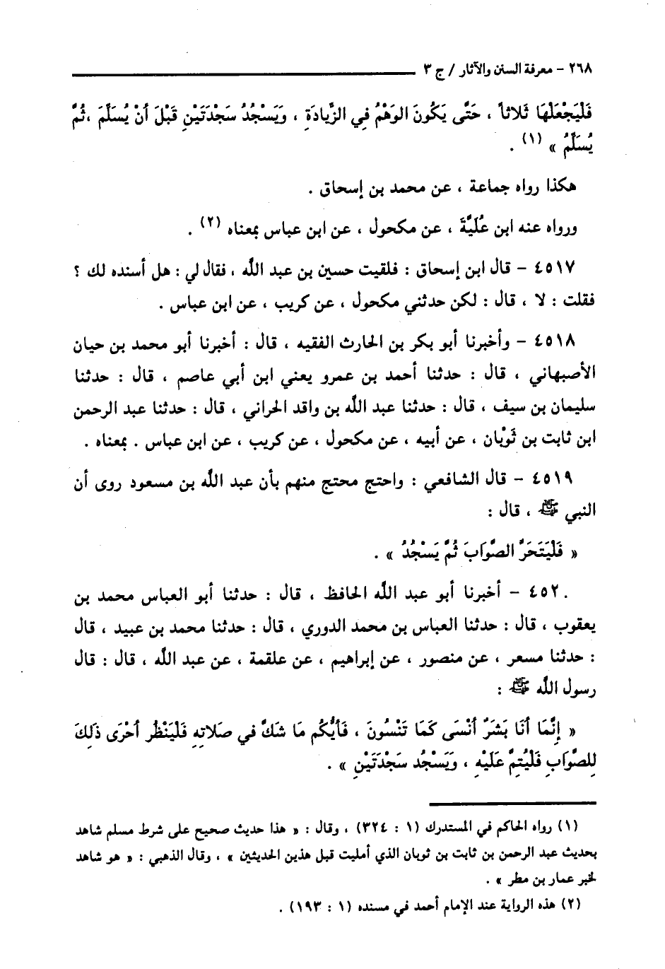 4520 - أَخْبَرَنَا أَبُو عَبْدِ اللَّهِ الْحَافِظُ قَالَ: حَدَّثَنَا أَبُو الْعَبَّاسِ مُحَمَّدُ بْنُ يَعْقُوبَ قَالَ: حَدَّثَنَا الْعَبَّاسُ بْنُ مُحَمَّدِ الدُّورِيُّ قَالَ: حَدَّثَنَا مُحَمَّدُ بْنُ عُبَيْدٍ قَالَ: حَدَّثَنَا مِسْعَرٌ، عَنْ مَنْصُورٍ، عَنْ إِبْرَاهِيمَ، عَنْ عَلْقَمَةَ، عَنْ عَبْدِ اللَّهِ قَالَ: قَالَ رَسُولُ اللَّهِ صَلَّى اللهُ عَلَيْهِ وَسَلَّمَ: «§إِنَّمَا أَنَا بَشَرٌ أَنْسَى، كَمَا تَنْسَوْنَ، فَأَيُّكُمْ مَا شَكَّ فِي صَلَاتِهِ، فَلْيَنْظُرْ أَحْرَى ذَلِكَ لِلصَّوَابِ، فَلْيُتِمَّ عَلَيْهِ، وَيَسْجُدْ سَجْدَتَيْنِ» -[269]-