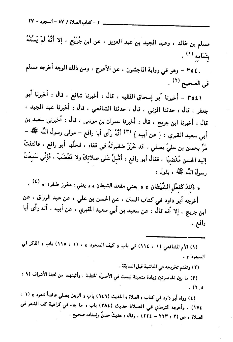 3541 - أَخْبَرَنَا أَبُو إِسْحَاقَ الْفَقِيهُ قَالَ: أَخْبَرَنَا شَافِعٌ قَالَ: أَخْبَرَنَا أَبُو جَعْفَرٍ قَالَ: حَدَّثَنَا الْمُزَنِيُّ قَالَ: حَدَّثَنَا الشَّافِعِيُّ قَالَ: أَخْبَرَنَا عَبْدُ الْمَجِيدِ قَالَ: أَخْبَرَنَا ابْنُ جُرَيْجٍ قَالَ: أَخْبَرَنَا عِمْرَانُ بْنُ مُوسَى قَالَ: أَخْبَرَنِي سَعِيدُ بْنُ أَبِي سَعِيدٍ الْمَقْبُرِيُّ، عَنْ أَبِيهِ، أَنَّهُ رَأَى أَبَا رَافِعٍ مَوْلَى رَسُولِ اللَّهِ صَلَّى اللهُ عَلَيْهِ وَسَلَّمَ، مَرَّ بِحَسَنِ بْنِ عَلِيٍّ يُصَلِّي، قَدْ غَرَزَ ضَفِيرَتَهُ فِي قَفَاهُ، فَحَلَّهَا أَبُو رَافِعٍ، فَالْتَفَتَ إِلَيْهِ الْحَسَنُ مُغْضَبًا، فَقَالَ أَبُو رَافِعٍ: §أَقْبِلْ عَلَى صَلَاتِكَ، وَلَا تَغْضَبْ، فَإِنِّي سَمِعْتُ رَسُولَ اللَّهِ صَلَّى اللهُ عَلَيْهِ وَسَلَّمَ، يَقُولُ: «ذَلِكَ كَفِعْلِ الشَّيْطَانِ» يَعْنِي مَقْعَدَ الشَّيْطَانِ، يَعْنِي مَغْرَزَ ضَفْرِهِ أَخْرَجَهُ أَبُو دَاوُدَ فِي كِتَابِ السُّنَنِ، عَنِ الْحَسَنِ بْنِ عَلِيٍّ، عَنْ عَبْدِ الرَّزَّاقِ، عَنِ ابْنِ جُرَيْجٍ، إِلَّا أَنَّهُ قَالَ: عَنْ سَعِيدِ بْنِ أَبِي سَعِيدٍ الْمَقْبُرِيِّ، عَنْ أَبِيهِ، أَنَّهُ رَأَى أَبَا رَافِعٍ -[28]-