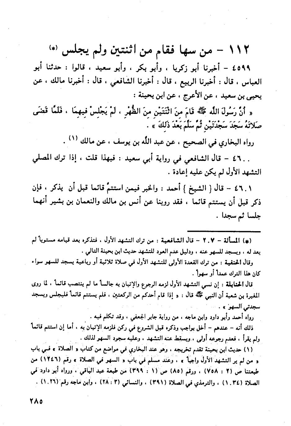 4599 - أَخْبَرَنَا أَبُو زَكَرِيَّا، وَأَبُو بَكْرٍ، وَأَبُو سَعِيدٍ، قَالُوا: حَدَّثَنَا أَبُو الْعَبَّاسِ قَالَ: أَخْبَرَنَا الرَّبِيعُ قَالَ: أَخْبَرَنَا الشَّافِعِيُّ قَالَ: أَخْبَرَنَا مَالِكٌ، عَنْ يَحْيَى بْنِ سَعِيدٍ، عَنِ الْأَعْرَجِ، عَنِ ابْنِ بُحَيْنَةَ، أَنَّ رَسُولَ اللَّهِ صَلَّى اللهُ عَلَيْهِ وَسَلَّمَ، «§قَامَ مِنَ اثْنَتَيْنِ مِنَ الظُّهْرِ، لَمْ يَجْلِسْ فِيهِمَا، فَلَمَّا قَضَى صَلَاتَهُ سَجَدَ سَجْدَتَيْنِ، ثُمَّ سَلَّمَ بَعْدَ ذَلِكَ» رَوَاهُ الْبُخَارِيُّ فِي الصَّحِيحِ، عَنْ عَبْدِ اللَّهِ بْنِ يُوسُفَ، عَنْ مَالِكٍ.