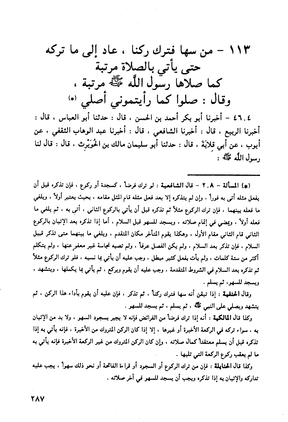 §مَنْ سَهَا فَتَرَكَ رُكْنًا عَادَ إِلَى مَا تَرَكَهُ، حَتَّى يَأْتِيَ بِالصَّلَاةِ مَرْتَبَةً كَمَا صَلَّاهَا رَسُولُ اللَّهِ صَلَّى اللهُ عَلَيْهِ وَسَلَّمَ مَرْتَبَةً، وَقَالَ: «صَلُّوا كَمَا رَأَيْتُمُونِي أُصَلِّي»