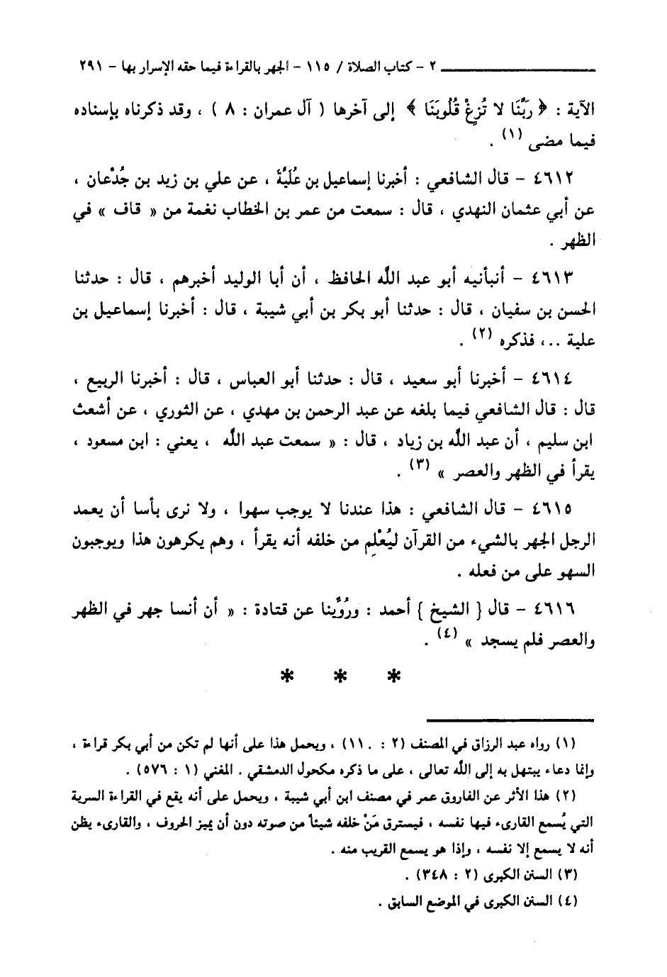 4612 - قَالَ الشَّافِعِيُّ: أَخْبَرَنَا إِسْمَاعِيلُ ابْنُ عُلَيَّةَ، عَنْ عَلِيِّ بْنِ زَيْدِ بْنِ جُدْعَانَ، عَنْ أَبِي عُثْمَانَ النَّهْدِيِّ قَالَ: سَمِعْتُ مِنْ عُمَرَ بْنِ الْخَطَّابِ «§نَغَمَةً مِنْ قَافٍ فِي الظُّهْرِ»،