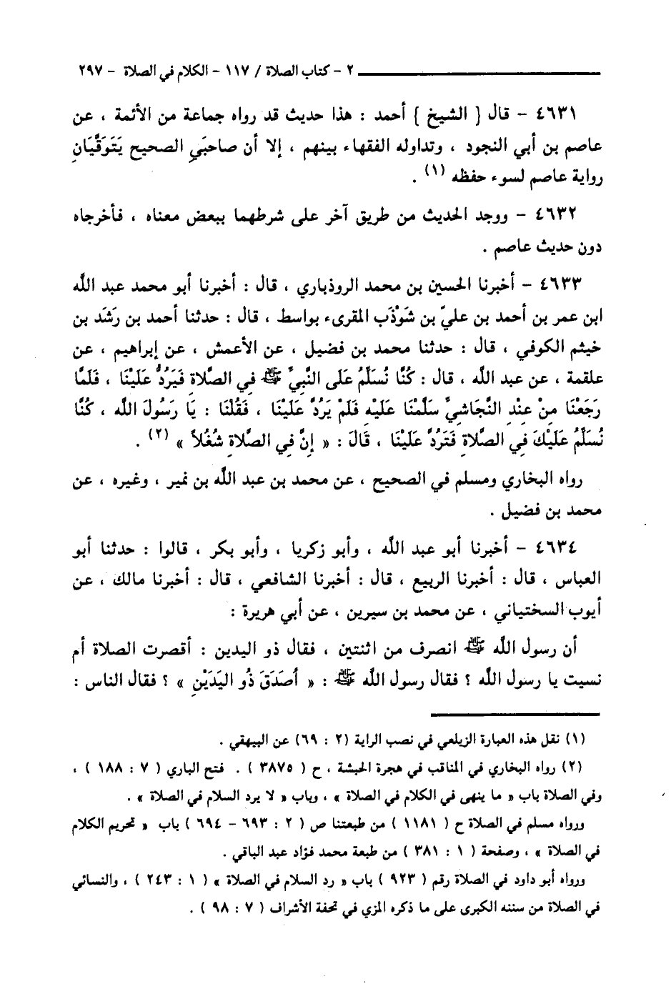 4633 - أَخْبَرَنَا الْحُسَيْنُ بْنُ مُحَمَّدٍ الرُّوذْبَارِيُّ قَالَ: أَخْبَرَنَا أَبُو مُحَمَّدٍ عَبْدُ اللَّهِ بْنُ عُمَرَ بْنِ أَحْمَدَ بْنِ عَلِيِّ بْنِ شَوْذَبٍ الْمُقْرِئُ بِوَاسِطٍ، قَالَ: حَدَّثَنَا أَحْمَدُ بْنُ رَشَدِ بْنِ خَيْثَمٍ الْكُوفِيُّ قَالَ: حَدَّثَنَا مُحَمَّدُ بْنُ فُضَيْلٍ، عَنِ الْأَعْمَشِ، عَنْ إِبْرَاهِيمَ، عَنْ عَلْقَمَةَ، عَنْ عَبْدِ اللَّهِ قَالَ: كُنَّا نُسَلِّمُ عَلَى النَّبِيِّ صَلَّى اللهُ عَلَيْهِ وَسَلَّمَ فِي الصَّلَاةِ، فَيَرُدُّ عَلَيْنَا، فَلَمَّا رَجَعْنَا مِنْ عِنْدِ النَّجَاشِيِّ سَلَّمْنَا عَلَيْهِ، فَلَمْ يَرُدَّ عَلَيْنَا، فَقُلْنَا: يَا رَسُولَ اللَّهِ كُنَّا نُسَلِّمُ عَلَيْكَ فِي الصَّلَاةِ، فَتَرُدُّ عَلَيْنَا قَالَ: «إِنَّ §فِي الصَّلَاةِ شُغُلًا» رَوَاهُ الْبُخَارِيُّ وَمُسْلِمٌ فِي الصَّحِيحِ، عَنْ مُحَمَّدِ بْنِ عَبْدِ اللَّهِ بْنِ نُمَيْرٍ، وَغَيْرِهِ عَنْ مُحَمَّدِ بْنِ فُضَيْلٍ