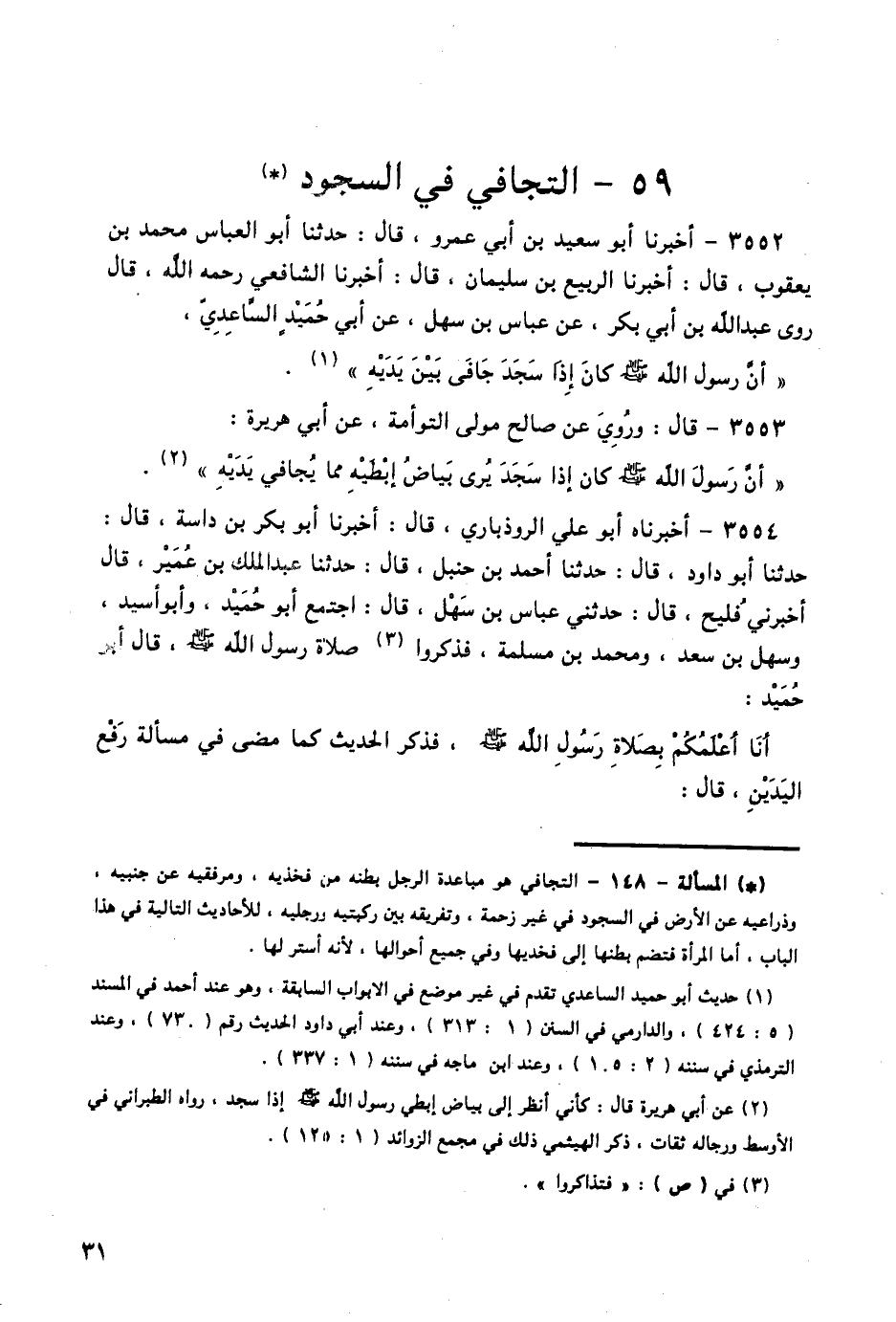 3552 - أَخْبَرَنَا أَبُو سَعِيدِ بْنُ أَبِي عَمْرٍو قَالَ: حَدَّثَنَا أَبُو الْعَبَّاسِ مُحَمَّدُ بْنُ يَعْقُوبَ قَالَ: أَخْبَرَنَا الرَّبِيعُ بْنُ سُلَيْمَانَ قَالَ: أَخْبَرَنَا الشَّافِعِيُّ، رَحِمَهُ اللَّهُ قَالَ: رَوَى عَبْدُ اللَّهِ بْنُ أَبِي بَكْرٍ، عَنْ عَبَّاسِ بْنِ سَهْلٍ، عَنْ أَبِي حُمَيْدٍ السَّاعِدِيِّ، أَنَّ رَسُولَ اللَّهِ صَلَّى اللهُ عَلَيْهِ وَسَلَّمَ، كَانَ § «إِذَا سَجَدَ جَافَى بَيْنَ يَدَيْهِ»