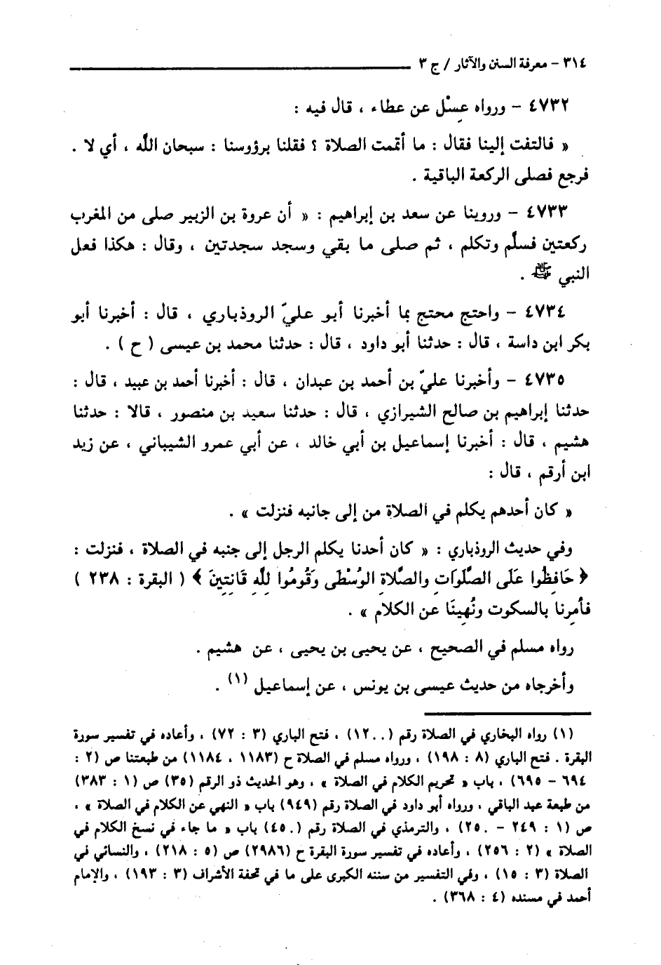 4735 - وَأَخْبَرَنَا عَلِيُّ بْنُ أَحْمَدَ بْنِ عَبْدَانَ قَالَ: أَخْبَرَنَا أَحْمَدُ بْنُ عُبَيْدٍ قَالَ: حَدَّثَنَا إِبْرَاهِيمُ بْنُ صَالِحٍ الشِّيرَازِيُّ قَالَ: حَدَّثَنَا سَعِيدُ بْنُ مَنْصُورٍ قَالَا: حَدَّثَنَا هُشَيْمٌ قَالَ: أَخْبَرَنَا إِسْمَاعِيلُ بْنُ أَبِي خَالِدٍ، عَنْ أَبِي عَمْرٍو الشَّيْبَانِيِّ، عَنْ زَيْدِ بْنِ أَرْقَمَ قَالَ: «كَانَ أَحَدُهُمْ يُكَلِّمُ فِي الصَّلَاةِ مَنْ إِلَى جَانِبِهِ، فَنَزَلَتْ» وَفِي حَدِيثِ الرُّوذَبَارِيِّ: " كَانَ أَحَدُنَا يُكَلِّمُ الرَّجُلَ إِلَى جَنْبِهِ فِي الصَّلَاةِ، فَنَزَلَتْ: {§حَافِظُوا عَلَى الصَّلَوَاتِ، وَالصَّلَاةِ الْوُسْطَى، وَقُومُوا لِلَّهِ قَانِتِينَ} [البقرة: 238]، فَأُمِرْنَا بِالسُّكُوتِ، وَنُهِينَا عَنِ الْكَلَامِ " رَوَاهُ مُسْلِمٌ فِي الصَّحِيحِ، عَنْ يَحْيَى بْنِ يَحْيَى، عَنْ هُشَيْمٍ، وَأَخْرَجَاهُ مِنْ حَدِيثِ عِيسَى بْنِ يُونُسَ، عَنْ إِسْمَاعِيلَ -[315]-،