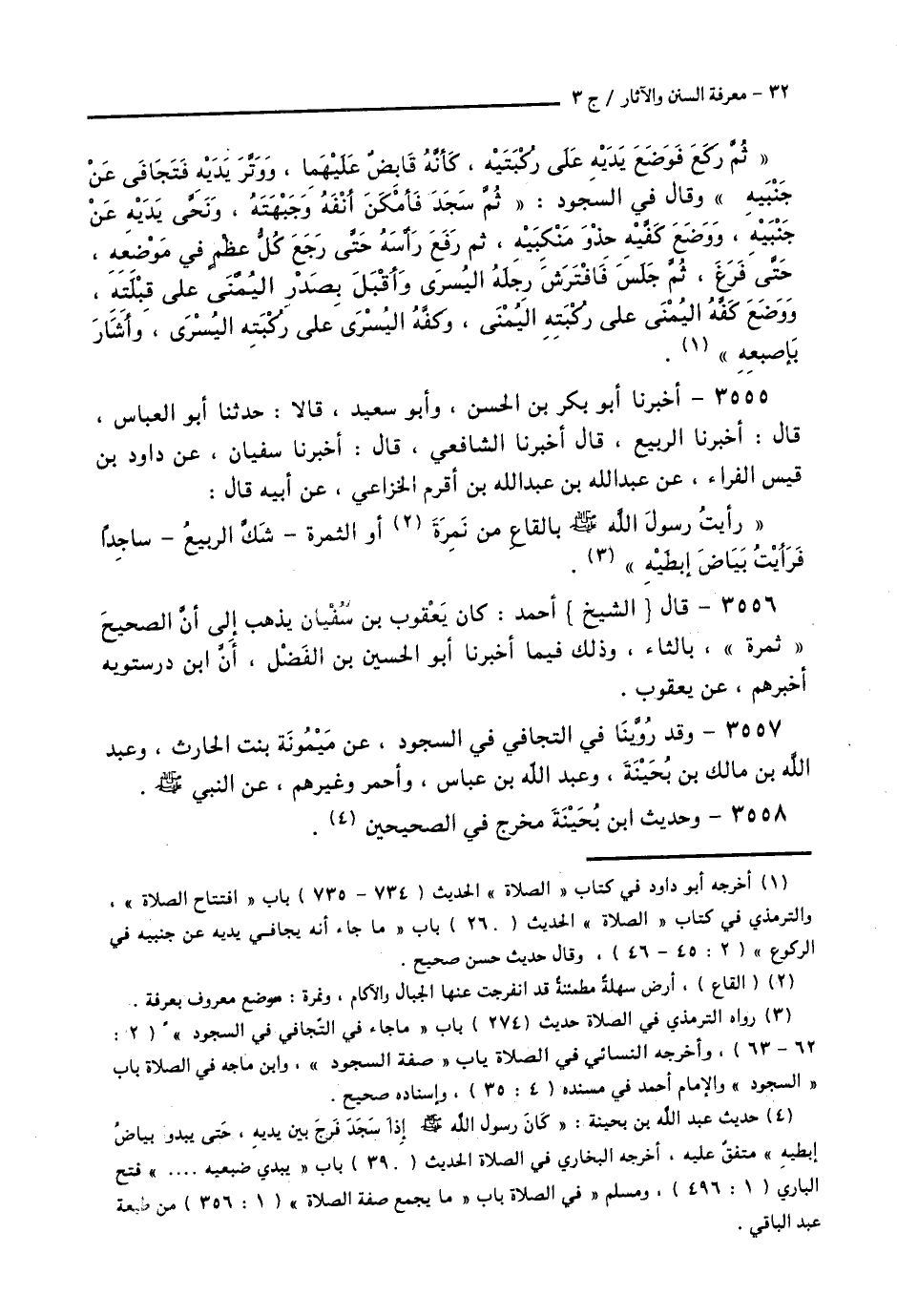 3557 - وَقَدْ رُوِّينَا فِي التَّجَافِي فِي السُّجُودِ، عَنْ مَيْمُونَةَ بِنْتِ الْحَارِثِ، وَعَبْدِ اللَّهِ بْنِ مَالِكِ بْنِ بُحَيْنَةَ، وَعَبْدِ اللَّهِ بْنِ عَبَّاسٍ، وَأَحْمَرَ، وَغَيْرِهِمْ، عَنِ النَّبِيِّ صَلَّى اللهُ عَلَيْهِ وَسَلَّمَ،