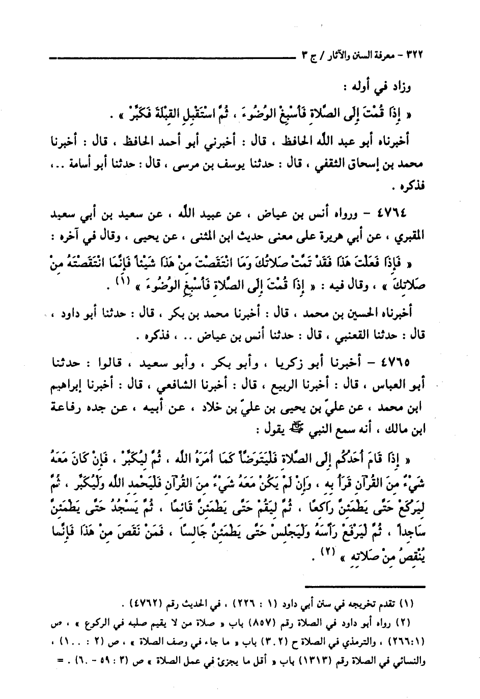 4765 - أَخْبَرَنَا أَبُو زَكَرِيَّا، وَأَبُو بَكْرٍ، وَأَبُو سَعِيدٍ، قَالُوا: حَدَّثَنَا أَبُو الْعَبَّاسِ قَالَ: أَخْبَرَنَا الرَّبِيعُ قَالَ: أَخْبَرَنَا الشَّافِعِيُّ قَالَ: أَخْبَرَنَا إِبْرَاهِيمُ بْنُ مُحَمَّدٍ، عَنْ عَلِيِّ بْنِ يَحْيَى بْنِ عَلِيِّ بْنِ خَلَّادٍ، عَنْ أَبِيهِ، عَنْ جَدِّهِ رِفَاعَةَ بْنِ مَالِكٍ أَنَّهُ سَمِعَ النَّبِيَّ صَلَّى اللهُ عَلَيْهِ وَسَلَّمَ، يَقُولُ: «§إِذَا قَامَ أَحَدُكُمْ إِلَى الصَّلَاةِ، فَلْيَتَوَضَّأْ كَمَا أَمَرَهُ اللَّهُ، ثُمَّ لْيُكَبِّرْ، فَإِنْ كَانَ مَعَهُ شَيْءٌ مِنَ الْقُرْآنِ قَرَأَ بِهِ، وَإِنْ لَمْ يَكُنْ مَعَهُ شَيْءٌ مِنَ الْقُرْآنِ، فَلْيَحْمَدِ اللَّهَ، وَلْيُكَبِّرْ، ثُمَّ لْيَرْكَعْ، حَتَّى يَطْمَئِنَّ رَاكِعًا، ثُمَّ لْيَقُمْ، حَتَّى يَطْمَئِنَّ قَائِمًا، ثُمَّ يَسْجُدْ، حَتَّى يَطْمَئِنَّ سَاجِدًا، ثُمَّ لْيَرْفَعْ رَأْسَهُ، وَلْيَجْلِسْ حَتَّى يَطْمَئِنَّ جَالِسًا، فَمَا نَقَصَ مِنْ هَذَا، فَإِنَّمَا يُنْقِصُ مِنْ صَلَاتِهِ» -[323]-