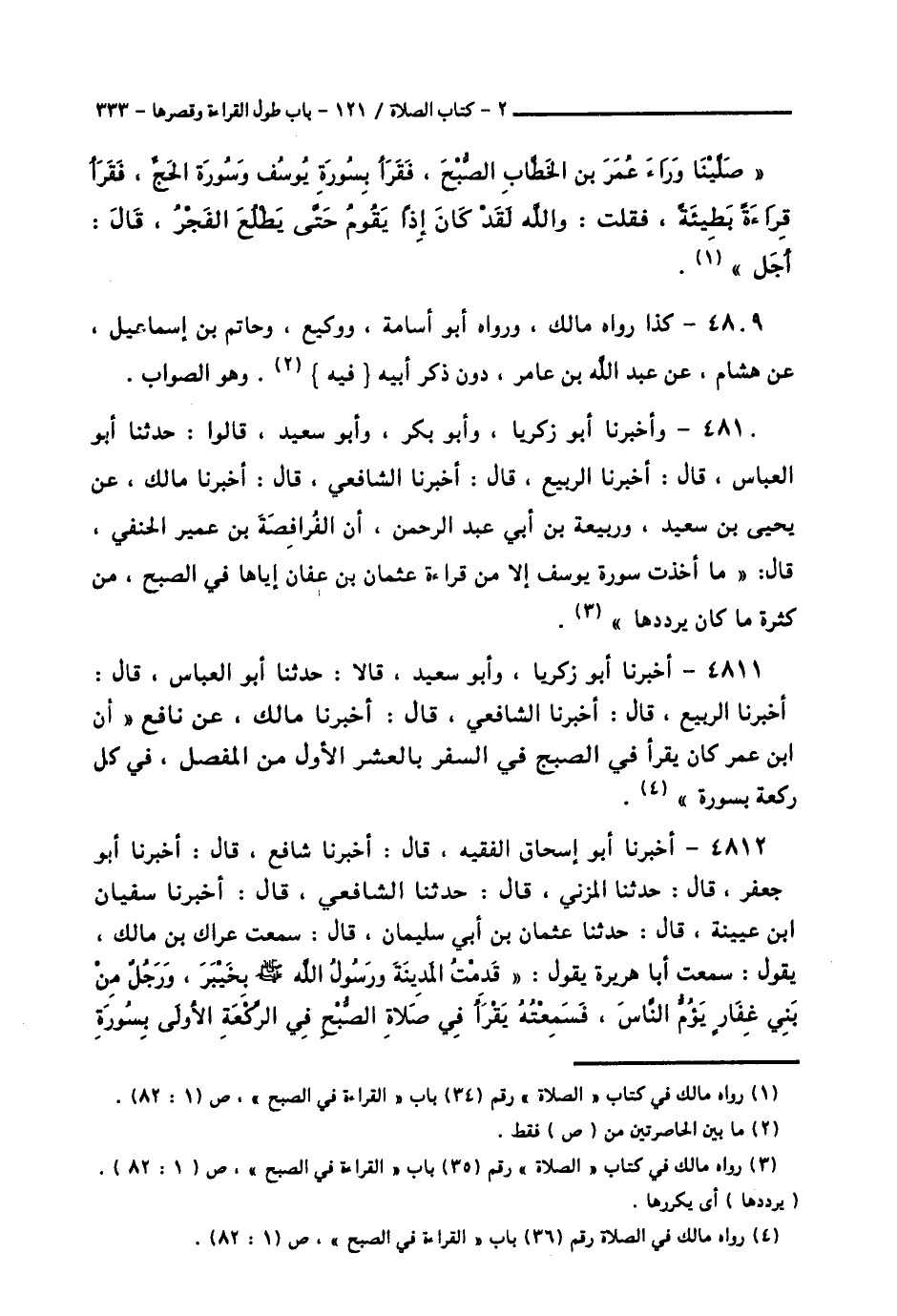 4811 - أَخْبَرَنَا أَبُو زَكَرِيَّا، وَأَبُو سَعِيدٍ قَالَا: حَدَّثَنَا أَبُو الْعَبَّاسِ قَالَ: أَخْبَرَنَا الرَّبِيعُ قَالَ: أَخْبَرَنَا الشَّافِعِيُّ قَالَ: أَخْبَرَنَا مَالِكٌ، عَنْ نَافِعٍ، أَنَّ ابْنَ عُمَرَ «كَانَ §يَقْرَأُ فِي الصُّبْحِ فِي السَّفَرِ بِالْعَشْرِ الْأُوَلِ، مِنَ الْمُفَصَّلِ فِي كُلِّ رَكْعَةٍ، بِسُورَةٍ»