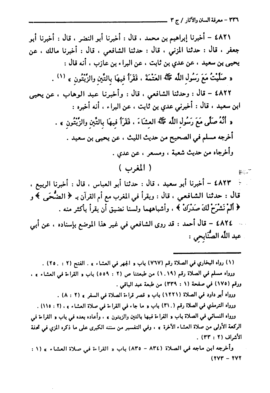 4822 - قَالَ: وَحَدَّثَنَا الشَّافِعِيُّ قَالَ: وَأَخْبَرَنَا عَبْدُ الْوَهَّابِ، عَنْ يَحْيَى بْنِ سَعِيدٍ قَالَ: أَخْبَرَنِي عَدِيُّ بْنُ ثَابِتٍ، عَنِ الْبَرَاءِ، أَنَّهُ أَخْبَرَهُ: «أَنَّهُ §صَلَّى مَعَ رَسُولِ اللَّهِ صَلَّى اللهُ عَلَيْهِ وَسَلَّمَ الْعِشَاءَ، فَقَرَأَ فِيهَا بِـ وَالتِّينِ وَالزَّيْتُونِ»، أَخْرَجَهُ مُسْلِمٌ فِي الصَّحِيحِ، مِنْ حَدِيثِ اللَّيْثِ عَنْ يَحْيَى بْنِ سَعِيدٍ، وَأَخْرَجَاهُ مِنْ حَدِيثِ شُعْبَةَ، وَمِسْعَرٍ عَنْ عَدِيٍّ
