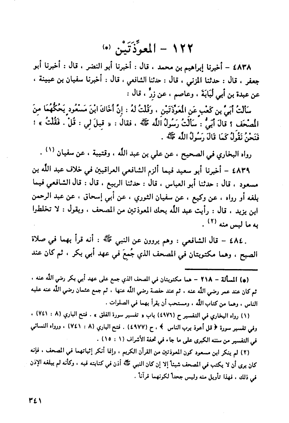 4838 - أَخْبَرَنَا إِبْرَاهِيمُ بْنُ مُحَمَّدٍ قَالَ: أَخْبَرَنَا أَبُو النَّضْرِ قَالَ: أَخْبَرَنَا أَبُو جَعْفَرٍ قَالَ: حَدَّثَنَا الْمُزَنِيُّ قَالَ: حَدَّثَنَا الشَّافِعِيُّ قَالَ: أَخْبَرَنَا سُفْيَانُ بْنُ عُيَيْنَةَ، عَنْ عَبْدَةَ بْنِ أَبِي لُبَابَةَ، وَعَاصِمٍ، عَنْ زِرٍّ قَالَ: سَأَلْتُ أُبَيَّ بْنَ كَعْبٍ §عَنِ الْمُعَوِّذَتَيْنِ، وَقُلْتُ لَهُ: إِنَّ أَخَاكَ ابْنَ مَسْعُودٍ يَحُكُّهُمَا مِنَ الْمُصْحَفِ؟ قَالَ أُبَيٌّ: سَأَلْتُ رَسُولَ اللَّهِ صَلَّى اللهُ عَلَيْهِ وَسَلَّمَ: فَقَالَ: قِيلَ لِي: «قُلْ»، فَقُلْتُ: «فَنَحْنُ نَقُولُ كَمَا قَالَ رَسُولُ اللَّهِ صَلَّى اللهُ عَلَيْهِ وَسَلَّمَ»، رَوَاهُ الْبُخَارِيُّ فِي الصَّحِيحِ، عَنْ عَلِيِّ بْنِ عَبْدِ اللَّهِ، وَقُتَيْبَةَ، عَنْ سُفْيَانَ