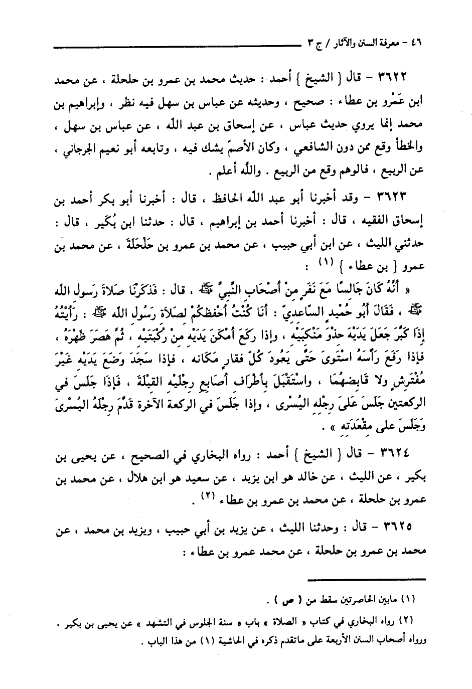 3623 - وَقَدْ أَخْبَرَنَا أَبُو عَبْدِ اللَّهِ الْحَافِظُ قَالَ: أَخْبَرَنَا أَبُو بَكْرٍ أَحْمَدُ بْنُ إِسْحَاقَ الْفَقِيهُ قَالَ: أَخْبَرَنَا أَحْمَدُ بْنُ إِبْرَاهِيمَ قَالَ: حَدَّثَنَا ابْنُ بُكَيْرٍ قَالَ: حَدَّثَنِي اللَّيْثُ، عَنِ ابْنِ أَبِي حَبِيبٍ، عَنْ مُحَمَّدِ بْنِ عَمْرِو بْنِ حَلْحَلَةَ، عَنْ مُحَمَّدِ بْنِ عَمْرِو بْنِ عَطَاءٍ -[47]-، أَنَّهُ كَانَ جَالِسًا، مَعَ نَفَرٍ مِنْ أَصْحَابِ النَّبِيِّ صَلَّى اللهُ عَلَيْهِ وَسَلَّمَ قَالَ: فَذَكَرْنَا صَلَاةَ رَسُولِ اللَّهِ صَلَّى اللهُ عَلَيْهِ وَسَلَّمَ، فَقَالَ أَبُو حُمَيْدٍ السَّاعِدِيُّ: «أَنَا كُنْتُ أَحْفَظَكُمْ لِصَلَاةِ رَسُولِ اللَّهِ صَلَّى اللهُ عَلَيْهِ وَسَلَّمَ، رَأَيْتُهُ §إِذَا كَبَّرَ، جَعَلَ يَدَيْهِ حِذْوَ مَنْكِبَيْهِ، وَإِذَا رَكَعَ أَمْكَنَ يَدَيْهِ مِنْ رُكْبَتَيْهِ، ثُمَّ هَصَرَ ظَهْرَهُ، فَإِذَا رَفَعَ رَأْسَهُ، اسْتَوَى، حَتَّى يَعُودَ كُلُّ فَقَارٍ مَكَانَهُ، فَإِذَا سَجَدَ وَضَعَ يَدَيْهِ، غَيْرَ مُفْتَرِشٍ، وَلَا قَابِضِهِمَا، وَاسْتَقْبَلَ بِأَطْرَافِ أَصَابِعِ رِجْلَيْهِ الْقِبْلَةَ، فَإِذَا جَلَسَ فِي الرَّكْعَتَيْنِ، جَلَسَ عَلَى رِجْلِهِ الْيُسْرَى، وَإِذَا جَلَسَ فِي الرَّكْعَةِ الْآخِرَةِ، قَدَّمَ رِجْلَهُ الْيُسْرَى، وَجَلَسَ عَلَى مَقْعَدَتِهِ»