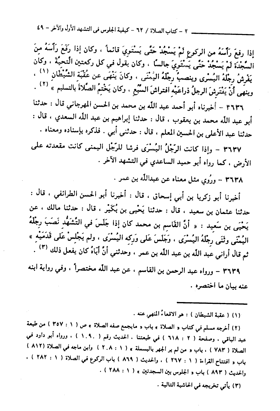 3638 - وَرُوِيَ مِثْلُ مَعْنَاهُ عَنْ عَبْدِ اللَّهِ بْنِ عُمَرَ، أَخْبَرَنَا أَبُو زَكَرِيَّا بْنُ أَبِي إِسْحَاقَ قَالَ: أَخْبَرَنَا أَبُو الْحَسَنِ الطَّرَائِفِيُّ قَالَ: حَدَّثَنَا عُثْمَانُ بْنُ سَعِيدٍ قَالَ: حَدَّثَنَا يَحْيَى بْنُ بُكَيْرٍ قَالَ: حَدَّثَنَا مَالِكٌ، عَنْ يَحْيَى بْنِ سَعِيدٍ، أَنَّ الْقَاسِمَ بْنَ مُحَمَّدٍ «كَانَ §إِذَا جَلَسَ فِي التَّشَهُّدِ، نَصَبَ رِجْلَهُ الْيُمْنَى، وَثَنَى رِجْلَهُ الْيُسْرَى، وَجَلَسَ عَلَى وَرِكِهِ الْيُسْرَى، وَلَمْ يَجْلِسْ عَلَى قَدَمَيْهِ» ثُمَّ قَالَ: «أَرَانِي عَبْدُ اللَّهِ بْنُ عَبْدِ اللَّهِ بْنِ عُمَرَ، وَحَدَّثَنِي أَنَّ أَبَاهُ كَانَ يَفْعَلُ ذَلِكَ»