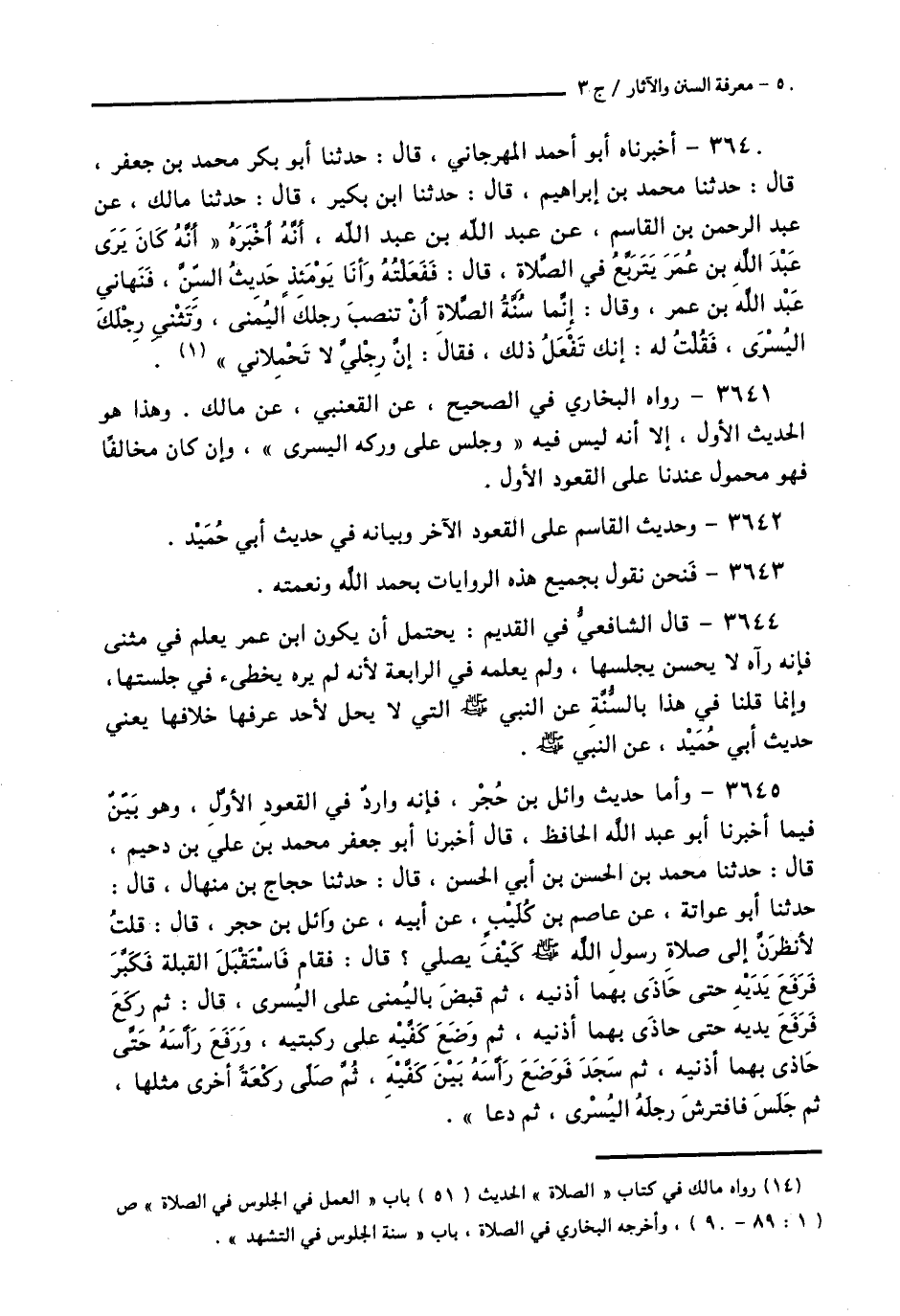 3641 - رَوَاهُ الْبُخَارِيُّ فِي الصَّحِيحِ، عَنِ الْقَعْنَبِيِّ، عَنْ مَالِكٍ، وَهَذَا هُوَ الْحَدِيثُ الْأَوَّلُ، إِلَّا أَنَّهُ لَيْسَ فِيهِ: «وَجَلَسَ عَلَى وَرِكِهِ الْيُسْرَى، وَإِنْ كَانَ مُخَالِفًا، فَهُوَ مَحْمُولٌ عِنْدَنَا، عَلَى الْقُعُودِ الْأَوَّلِ»،