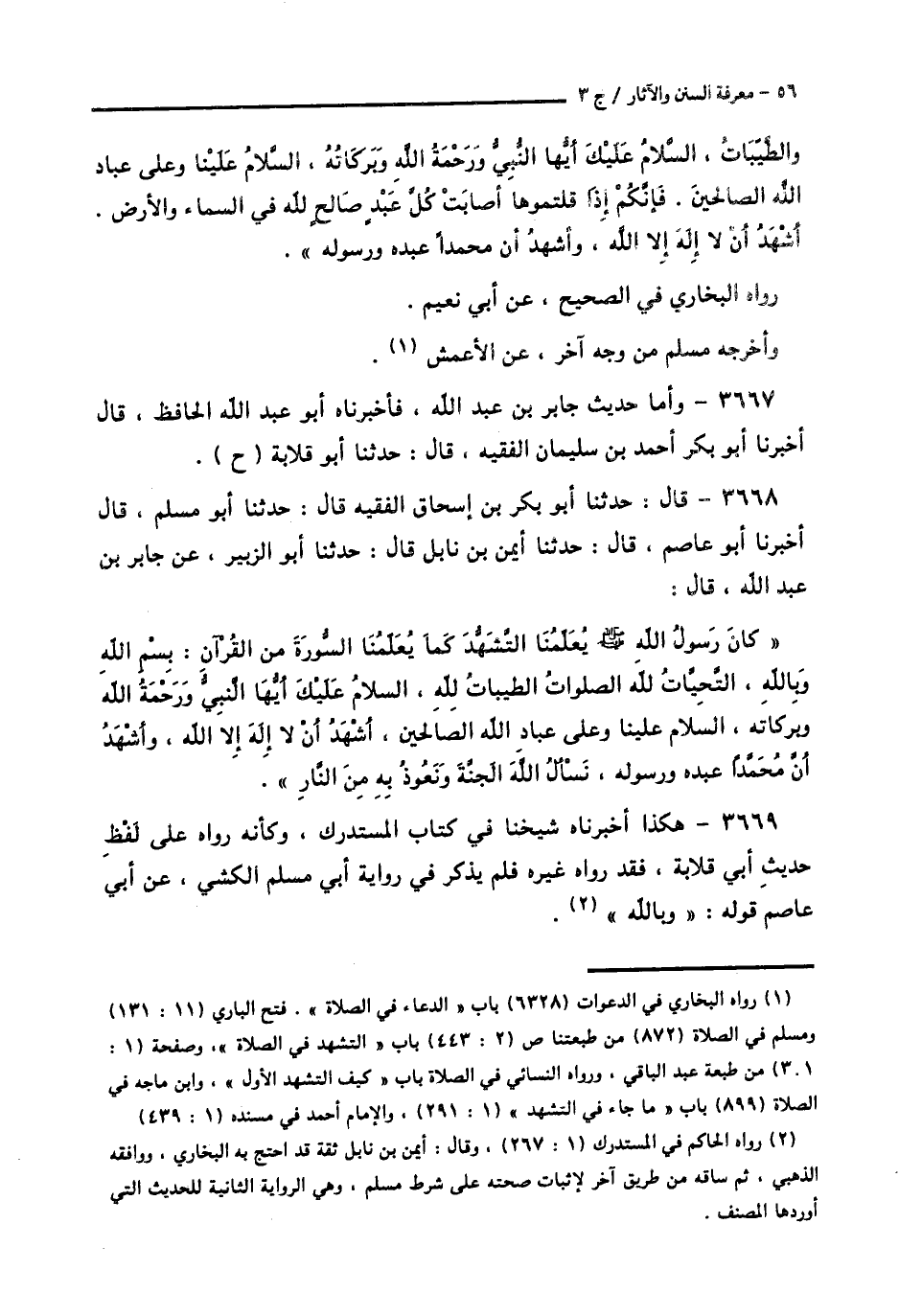 3668 - قَالَ: حَدَّثَنَا أَبُو بَكْرِ بْنُ إِسْحَاقَ الْفَقِيهُ قَالَ: حَدَّثَنَا أَبُو مُسْلِمٍ قَالَ: أَخْبَرَنَا أَبُو عَاصِمٍ قَالَ: حَدَّثَنَا أَيْمَنُ بْنُ نَابِلٍ، قَالَ حَدَّثَنَا أَبُو الزُّبَيْرِ، عَنْ جَابِرِ بْنِ عَبْدِ اللَّهِ قَالَ: كَانَ رَسُولُ اللَّهِ صَلَّى اللهُ عَلَيْهِ وَسَلَّمَ، يُعَلِّمُنَا التَّشَهُّدَ كَمَا يُعَلِّمُنَا السُّورَةَ مِنَ الْقُرْآنِ: «بِسْمِ اللَّهِ وَبِاللَّهِ، §التَّحِيَّاتُ لِلَّهِ، الصَّلَوَاتُ الطَّيِّبَاتُ لِلَّهِ، السَّلَامُ عَلَيْكَ أَيُّهَا النَّبِيُّ وَرَحْمَةُ اللَّهِ وَبَرَكَاتُهُ، السَّلَامُ عَلَيْنَا وَعَلَى عِبَادِ اللَّهِ الصَّالِحِينَ، أَشْهَدُ أَنْ لَا إِلَهَ إِلَّا اللَّهُ، وَأَشْهَدُ أَنَّ مُحَمَّدًا عَبْدُهُ وَرَسُولُهُ، نَسْأَلُ اللَّهَ الْجَنَّةَ، وَنَعُوذُ بِهِ مِنَ النَّارِ»