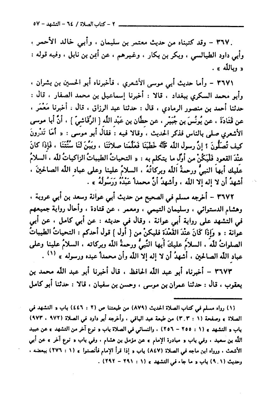 3672 - أَخْرَجَهُ مُسْلِمٌ فِي الصَّحِيحِ، مِنْ حَدِيثِ أَبِي عَوَانَةَ، وَسَعْدِ بْنِ أَبِي عَرُوبَةَ، وَهِشَامٍ الدَّسْتُوَائِيِّ، وَسُلَيْمَانَ التَّيْمِيِّ، وَمَعْمَرٍ، عَنْ قَتَادَةَ، وأَحَالَ رِوَايَةَ جَمِيعِهِمْ فِي التَّشَهُّدِ، عَلَى رِوَايَةِ أَبِي عَوَانَةَ، وَقَالَ فِي حَدِيثِهِ: عَنْ أَبِي كَامِلٍ، عَنْ أَبِي عَوَانَةَ: وَإِذَا كَانَ عِنْدَ الْقَعْدَةِ، فَلْيَكُنْ مِنْ أَوَّلِ قَوْلِ أَحَدِكُمْ: «§التَّحِيَّاتُ الطَّيِّبَاتُ الصَّلَوَاتُ لِلَّهِ، السَّلَامُ عَلَيْكَ أَيُّهَا النَّبِيُّ، وَرَحْمَةُ اللَّهِ وَبَرَكَاتُهُ، السَّلَامُ عَلَيْنَا وَعَلَى عِبَادِ اللَّهِ الصَّالِحِينَ، أَشْهَدُ أَنْ لَا إِلَهَ إِلَّا اللَّهُ، وَأَنَّ مُحَمَّدًا عَبْدُهُ وَرَسُولُهُ»