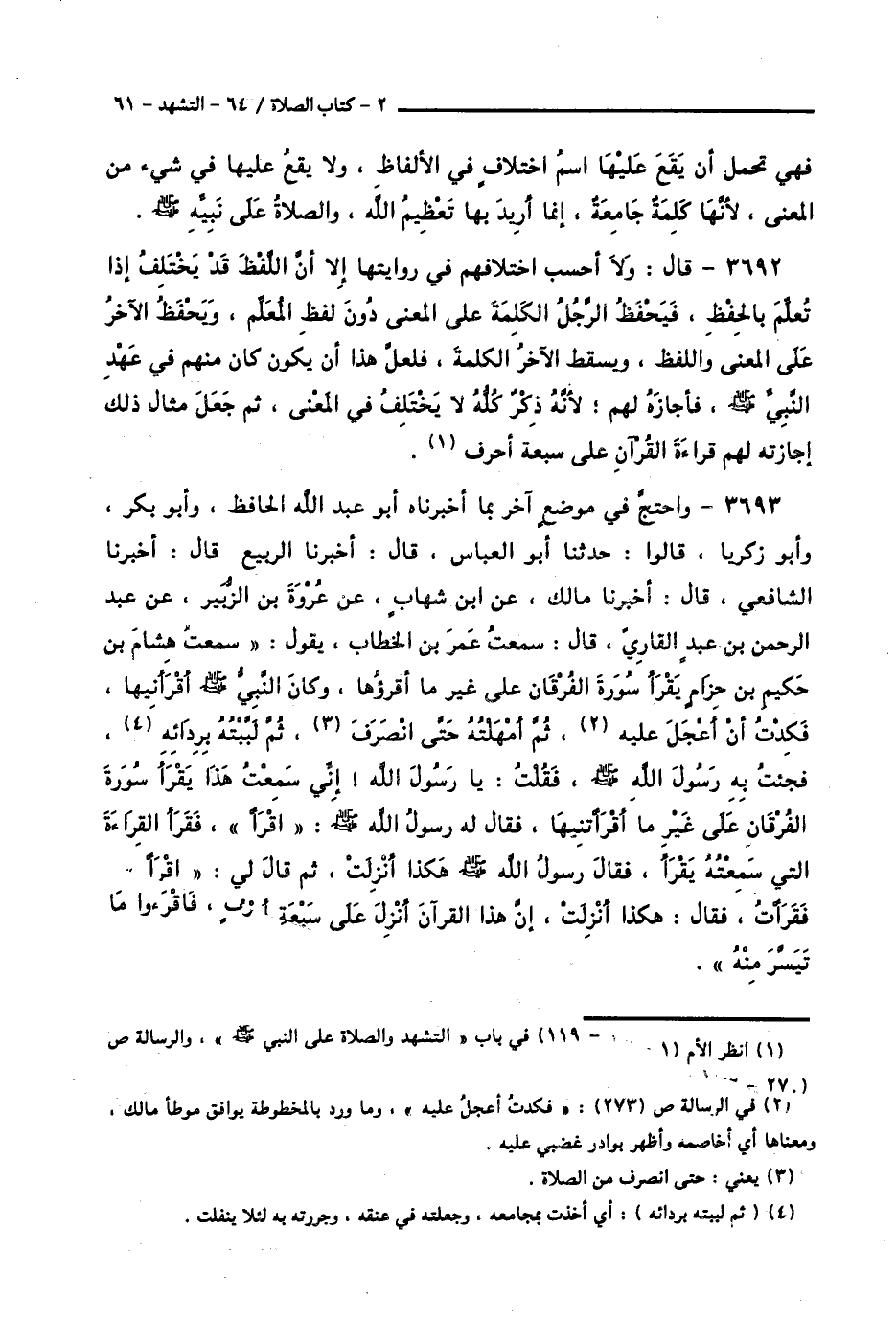 3693 - وَاحْتَجَّ فِي مَوْضِعٍ آخَرَ بِمَا أَخْبَرَنَاهُ أَبُو عَبْدِ اللَّهِ الْحَافِظُ، وَأَبُو بَكْرٍ، وَأَبُو زَكَرِيَّا، قَالُوا: حَدَّثَنَا أَبُو الْعَبَّاسِ قَالَ: أَخْبَرَنَا الرَّبِيعُ قَالَ: أَخْبَرَنَا الشَّافِعِيُّ قَالَ: أَخْبَرَنَا مَالِكٌ، عَنِ ابْنِ شِهَابٍ، عَنْ عُرْوَةَ بْنِ الزُّبَيْرِ، عَنْ عَبْدِ الرَّحْمَنِ بْنِ عَبْدٍ الْقَارِيِّ قَالَ: سَمِعْتُ عُمَرَ بْنَ الْخَطَّابِ، يَقُولُ: سَمِعْتُ هِشَامَ بْنَ حَكِيمِ بْنِ حِزَامٍ، يَقْرَأُ سُورَةَ الْفُرْقَانِ عَلَى غَيْرِ مَا أَقْرَؤُهَا، وَكَانَ النَّبِيُّ صَلَّى اللهُ عَلَيْهِ وَسَلَّمَ أَقْرَأَنِيهَا، فَكِدْتُ أَنْ أَعْجَلَ عَلَيْهِ، ثُمَّ أَمْهَلْتُهُ، حَتَّى انْصَرَفَ، ثُمَّ لَبَّبْتُهُ بِرِدَائِهِ، فَجِئْتُ بِهِ إِلَى رَسُولِ اللَّهِ صَلَّى اللهُ عَلَيْهِ وَسَلَّمَ، فَقُلْتُ: يَا رَسُولَ اللَّهِ إِنِّي سَمِعْتُ هَذَا يَقْرَأُ سُورَةَ الْفُرْقَانِ عَلَى غَيْرِ مَا أَقْرَأْتَنِيهَا، فَقَالَ لَهُ رَسُولُ اللَّهِ صَلَّى اللهُ عَلَيْهِ وَسَلَّمَ: «اقْرَأْ» فَقَرَأَ الْقِرَاءَةَ، الَّتِي سَمِعْتُهُ يَقْرَأُ، فَقَالَ رَسُولُ اللَّهِ صَلَّى اللهُ عَلَيْهِ وَسَلَّمَ: «هَكَذَا أُنْزِلَتْ» ثُمَّ قَالَ لِي: «اقْرَأْ» فَقَرَأْتُ، فَقَالَ: «هَكَذَا أُنْزِلَتْ، إِنَّ §هَذَا الْقُرْآنَ أُنْزِلَ عَلَى سَبْعَةِ أَحْرُفٍ، فَاقْرَءُوا مَا تَيَسَّرَ مِنْهُ» -[62]- أَخْرَجَاهُ فِي الصَّحِيحِ، مِنْ حَدِيثِ مَالِكٍ