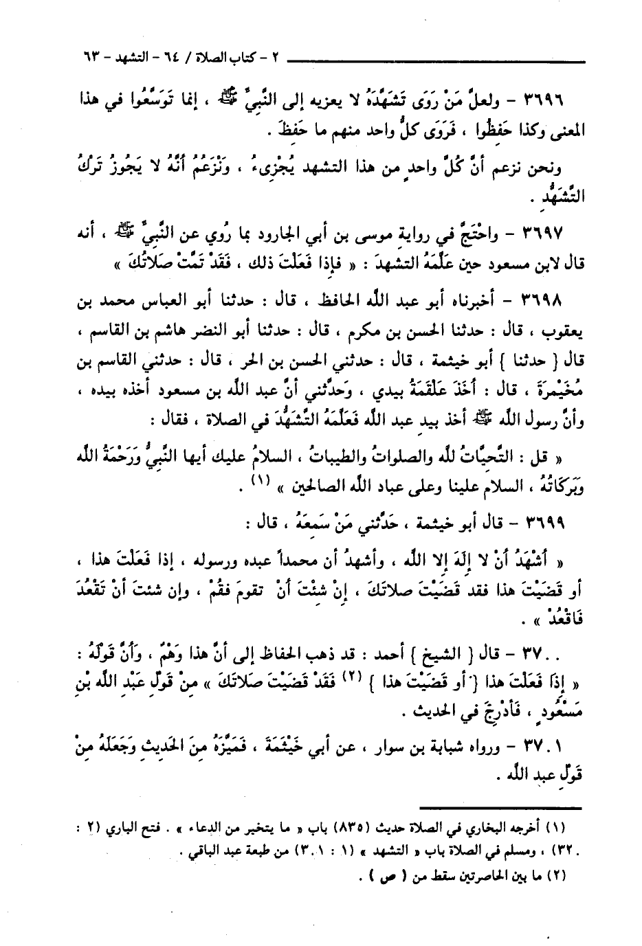 3699 - قَالَ أَبُو خَيْثَمَةَ حَدَّثَنِي مَنْ سَمِعَهُ قَالَ: «أَشْهَدُ أَنْ لَا إِلَهَ إِلَّا اللَّهُ، وَأَشْهَدُ أَنَّ مُحَمَّدًا عَبْدُهُ وَرَسُولُهُ» إِذَا فَعَلْتَ هَذَا، أَوْ قَضَيْتَ هَذَا، فَقَدْ قَضَيْتَ صَلَاتَكَ، إِنْ شِئْتَ أَنْ تَقُومَ، فَقُمْ، وَإِنْ شِئْتَ أَنْ تَقْعُدَ، فَاقْعُدْ