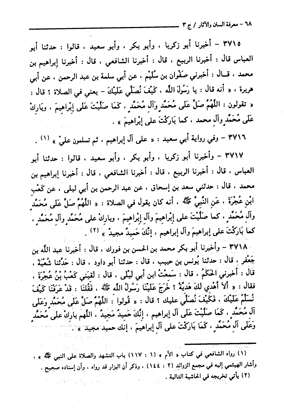 3717 - وَأَخْبَرَنَا أَبُو زَكَرِيَّا، وَأَبُو بَكْرٍ، وَأَبُو سَعِيدٍ، قَالُوا: حَدَّثَنَا أَبُو الْعَبَّاسِ قَالَ: أَخْبَرَنَا الرَّبِيعُ قَالَ: أَخْبَرَنَا الشَّافِعِيُّ قَالَ: أَخْبَرَنَا إِبْرَاهِيمُ بْنُ مُحَمَّدٍ قَالَ: حَدَّثَنِي سَعْدُ بْنُ إِسْحَاقَ، عَنْ عَبْدِ الرَّحْمَنِ بْنِ أَبِي لَيْلَى، عَنْ كَعْبِ بْنِ عُجْرَةَ، عَنِ النَّبِيِّ صَلَّى اللهُ عَلَيْهِ وَسَلَّمَ أَنَّهُ كَانَ يَقُولُ فِي الصَّلَاةِ: «§اللَّهُمَّ صَلِّ عَلَى مُحَمَّدٍ، وَآلِ مُحَمَّدٍ، كَمَا صَلَّيْتَ عَلَى إِبْرَاهِيمَ، وَآلِ إِبْرَاهِيمَ، وَبَارِكْ عَلَى مُحَمَّدٍ، وَآلِ مُحَمَّدٍ، كَمَا بَارَكْتَ عَلَى إِبْرَاهِيمَ، وَآلِ إِبْرَاهِيمَ، إِنَّكَ حَمِيدٌ مَجِيدٌ»