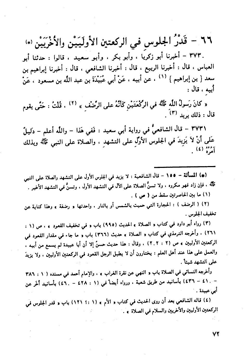 3731 - قَالَ الشَّافِعِيُّ فِي رِوَايَةِ أَبِي سَعِيدٍ: فَفِي هَذَا، وَاللَّهُ أَعْلَمُ، دَلِيلٌ عَلَى أَنْ لَا يَزِيدَ فِي الْجُلُوسِ الْأَوَّلِ عَلَى التَّشَهُّدِ، وَالصَّلَاةِ عَلَى النَّبِيِّ صَلَّى اللهُ عَلَيْهِ وَسَلَّمَ، وَبِذَلِكَ آمُرُهُ -[73]-،