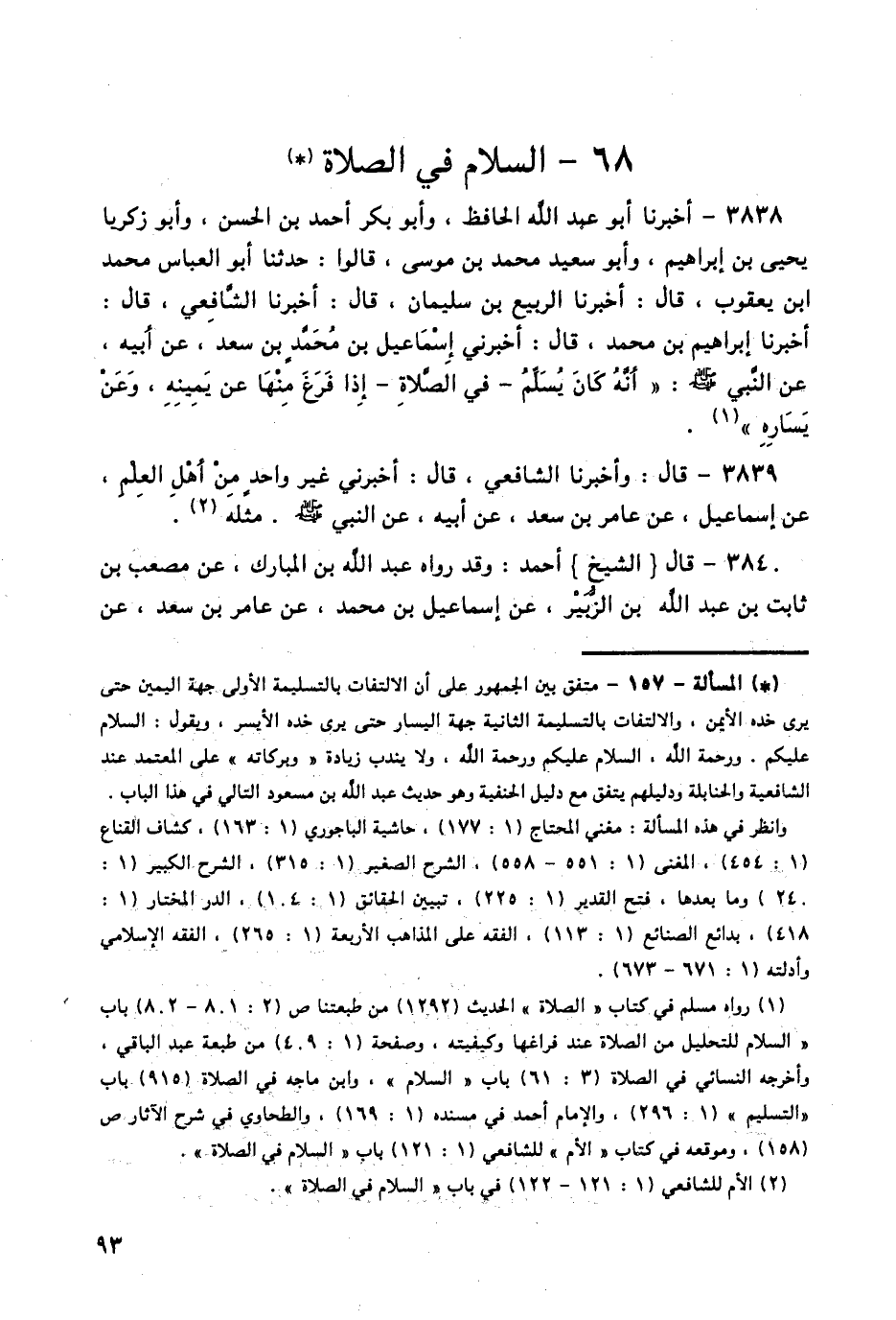 3840 - قَالَ الشَّيْخُ أَحْمَدُ: وَقَدْ رَوَاهُ عَبْدُ اللَّهِ بْنُ الْمُبَارَكِ، عَنْ مُصْعَبِ بْنِ ثَابِتِ بْنِ عَبْدِ اللَّهِ بْنِ الزُّبَيْرِ، عَنْ إِسْمَاعِيلَ بْنِ مُحَمَّدٍ، عَنْ عَامِرِ بْنِ سَعْدٍ، عَنْ -[94]- أَبِيهِ قَالَ: رَأَيْتُ رَسُولَ اللَّهِ صَلَّى اللهُ عَلَيْهِ وَسَلَّمَ، §يُسَلِّمُ فِي الصَّلَاةِ تَسْلِيمَتَيْنِ: تَسْلِيمَةً عَنْ يَمِينِهِ: «السَّلَامُ عَلَيْكُمْ، وَرَحْمَةُ اللَّهِ»، وَتَسْلِيمَةً عَنْ يَسَارِهِ: «السَّلَامُ عَلَيْكُمْ، وَرَحْمَةُ اللَّهِ»، حَتَّى يُرَى بَيَاضُ خَدَّيْهِ مَنْ هَاهُنَا، وَهَاهُنَا أَخْبَرَنَاهُ عَلِيُّ بْنُ أَحْمَدَ بْنِ عَبْدَانَ قَالَ: أَخْبَرَنَا أَحْمَدُ بْنُ عُبَيْدٍ قَالَ: حَدَّثَنَا عُبَيْدُ بْنُ شَرِيكٍ قَالَ: حَدَّثَنَا نُعَيْمُ بْنُ حَمَّادٍ قَالَ: حَدَّثَنَا ابْنُ الْمُبَارَكِ، فَذَكَرَهُ.