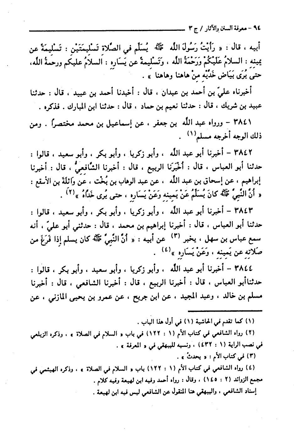 3842 - أَخْبَرَنَا أَبُو عَبْدِ اللَّهِ، وَأَبُو زَكَرِيَّا، وَأَبُو بَكْرٍ، وَأَبُو سَعِيدٍ، قَالُوا: حَدَّثَنَا أَبُو الْعَبَّاسِ قَالَ: أَخْبَرَنَا الرَّبِيعُ قَالَ: أَخْبَرَنَا الشَّافِعِيُّ قَالَ: أَخْبَرَنَا إِبْرَاهِيمُ، عَنْ إِسْحَاقَ بْنِ عَبْدِ اللَّهِ، عَنْ عَبْدِ الْوَهَّابِ بْنِ بُخْتٍ، عَنْ وَاثِلَةَ بْنِ الْأَسْقَعِ، أَنَّ النَّبِيَّ صَلَّى اللهُ عَلَيْهِ وَسَلَّمَ «كَانَ §يُسَلِّمُ عَنْ يَمِينِهِ وَعَنْ يَسَارِهِ حَتَّى يُرَى خَدَّاهُ»