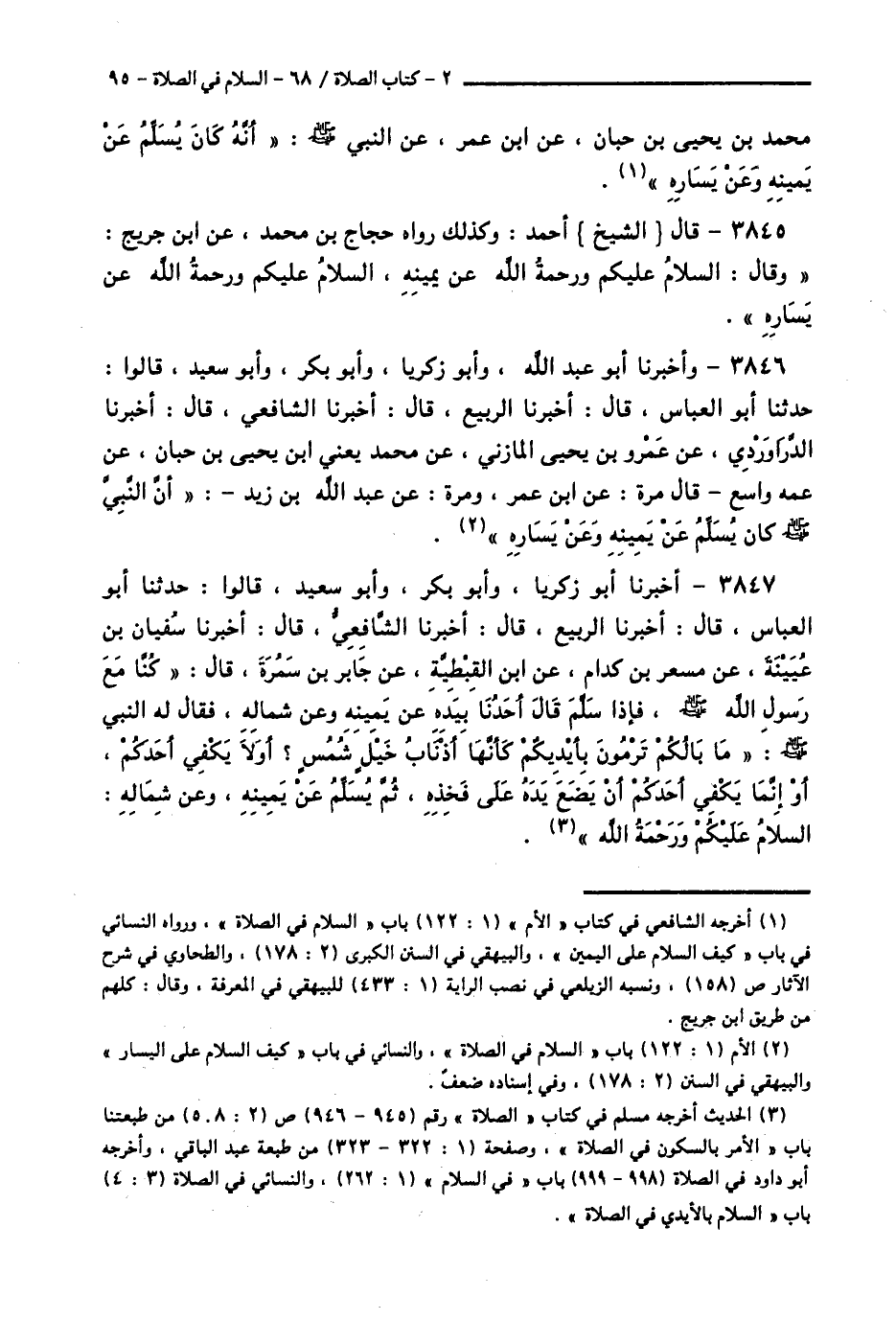 3846 - وَأَخْبَرَنَا أَبُو عَبْدِ اللَّهِ، وَأَبُو زَكَرِيَّا، وَأَبُو بَكْرٍ، وَأَبُو سَعِيدٍ قَالُوا: حَدَّثَنَا أَبُو الْعَبَّاسِ قَالَ: أَخْبَرَنَا الرَّبِيعُ قَالَ: أَخْبَرَنَا الشَّافِعِيُّ قَالَ: أَخْبَرَنَا الدَّرَاوَرْدِيُّ، عَنْ عَمْرِو بْنِ يَحْيَى الْمَازِنِيِّ، عَنْ مُحَمَّدِ يَعْنِي ابْنَ يَحْيَى بْنِ حَبَّانَ، عَنْ عَمِّهِ وَاسِعٍ قَالَ مَرَّةً: عَنِ ابْنِ عُمَرَ، وَمَرَّةً عَنْ عَبْدِ اللَّهِ بْنِ زَيْدٍ أَنَّ النَّبِيَّ صَلَّى اللهُ عَلَيْهِ وَسَلَّمَ «كَانَ §» يُسَلِّمُ عَنْ يَمِينِهِ وَعَنْ يَسَارِهِ "