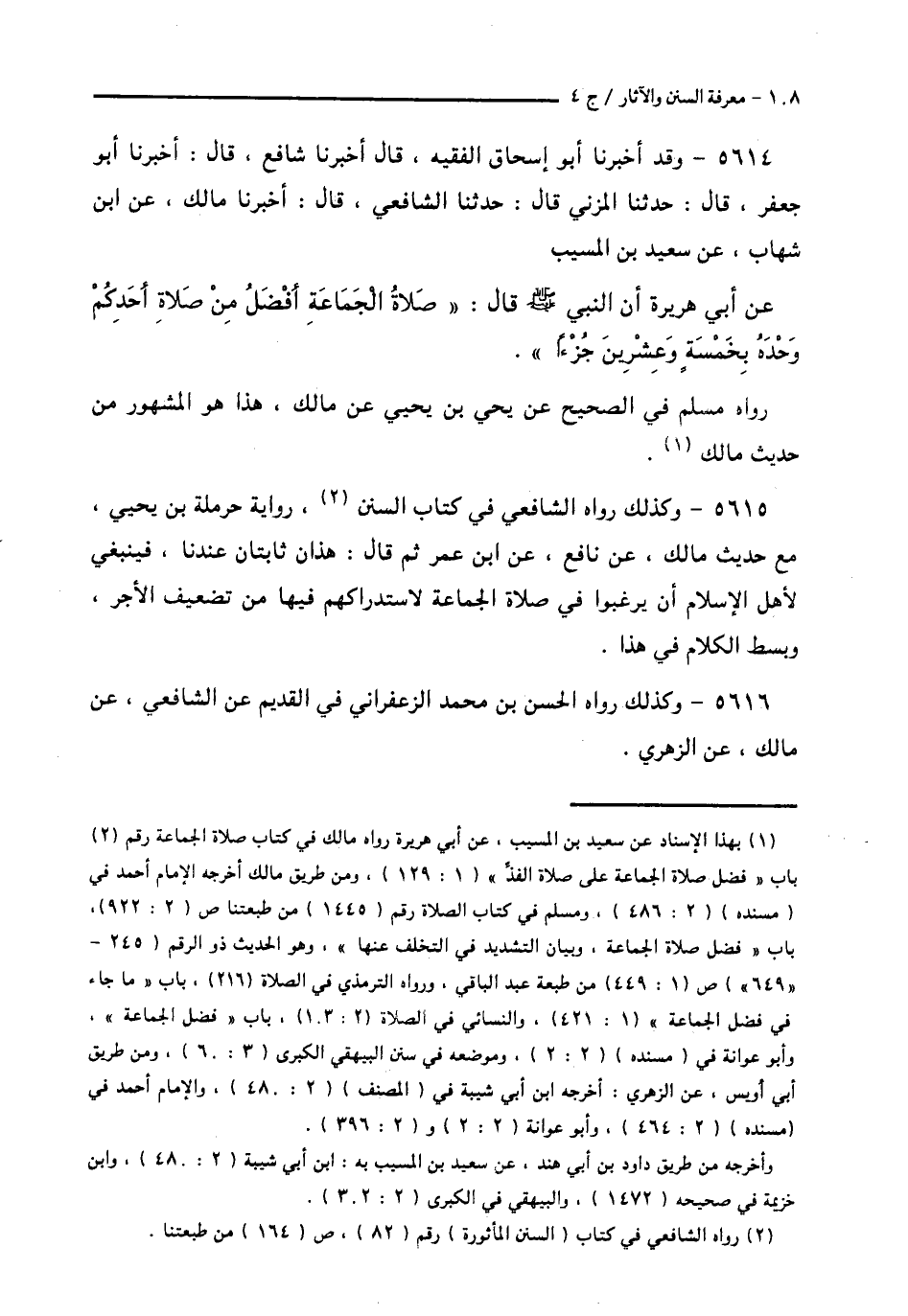 5615 - وَكَذَلِكَ رَوَاهُ الشَّافِعِيُّ فِي كِتَابِ السُّنَنِ رِوَايَةَ حَرْمَلَةَ بْنِ يَحْيَى مَعَ حَدِيثِ مَالِكٍ عَنْ نَافِعٍ، عَنِ ابْنِ عُمَرَ ثُمَّ قَالَ: هَذَانِ ثَابِتَانِ عِنْدَنَا، فَيَنْبَغِي لِأَهْلِ الْإِسْلَامِ أَنْ يَرْغَبُوا فِي صَلَاةِ الْجَمَاعَةِ لِاسْتِدْرَاكِهِمْ فِيهَا مِنْ تَضْعِيفِ الْأَجْرِ، وَبَسَطَ الْكَلَامَ فِي هَذَا