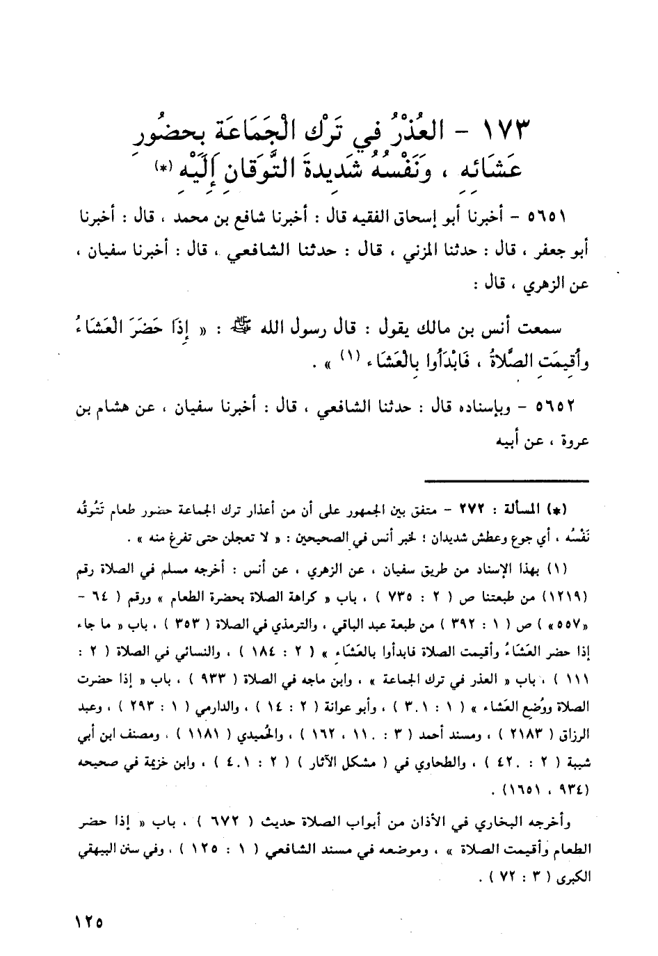 5651 - أَخْبَرَنَا أَبُو إِسْحَاقَ الْفَقِيهُ قَالَ: أَخْبَرَنَا شَافِعُ بْنُ مُحَمَّدٍ قَالَ: أَخْبَرَنَا أَبُو جَعْفَرٍ قَالَ: حَدَّثَنَا الْمُزَنِيُّ قَالَ: حَدَّثَنَا الشَّافِعِيُّ قَالَ: أَخْبَرَنَا سُفْيَانُ، عَنِ الزُّهْرِيِّ قَالَ: سَمِعْتُ أَنَسَ بْنَ مَالِكٍ يَقُولُ: قَالَ رَسُولُ اللَّهِ صَلَّى اللهُ عَلَيْهِ وَسَلَّمَ: «§إِذَا حَضَرَ الْعَشَاءُ وَأُقِيمَتِ الصَّلَاةُ، فَابْدَءُوا بِالْعَشَاءِ»