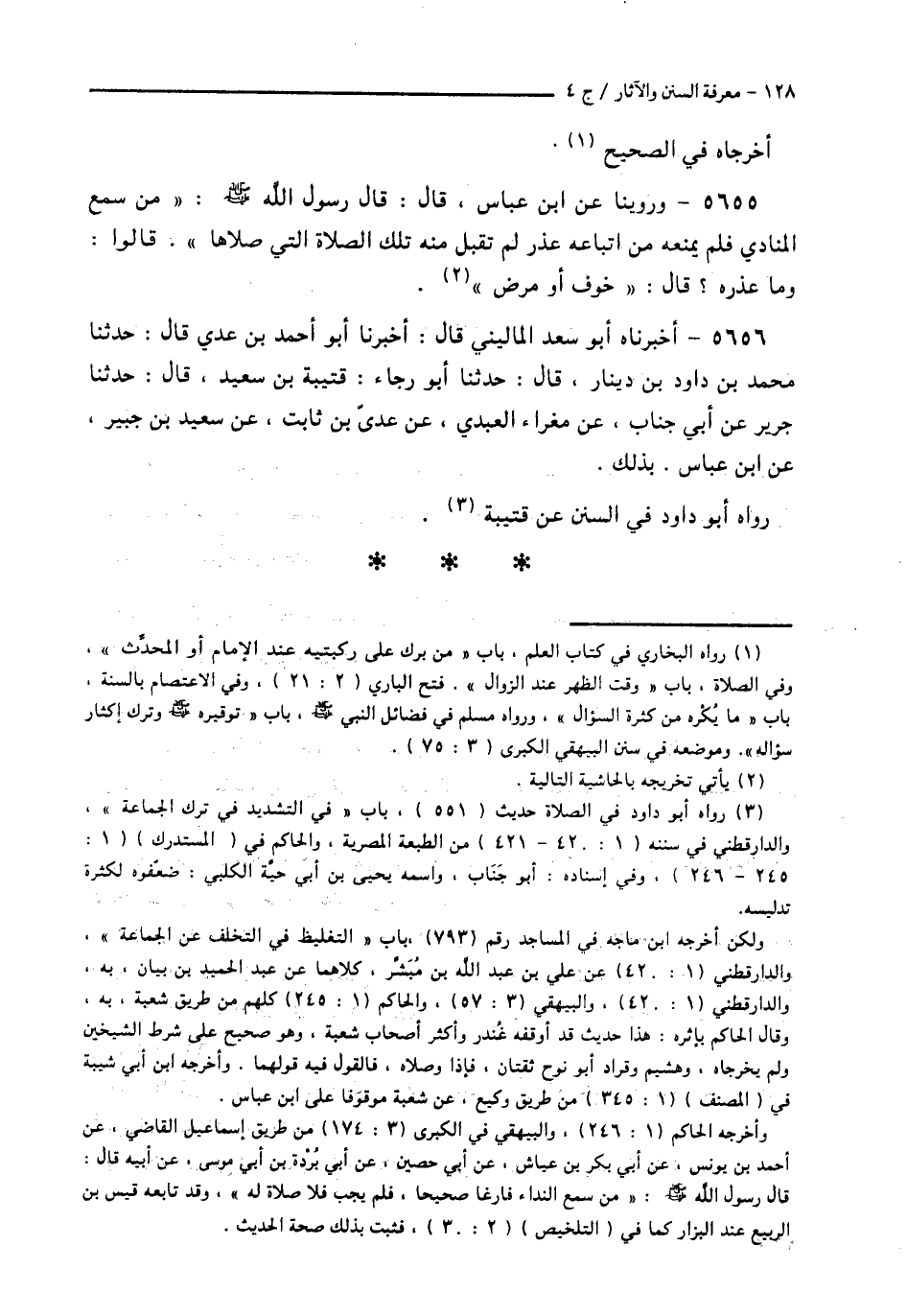 5655 - وَرُوِّينَا عَنِ ابْنِ عَبَّاسٍ قَالَ: قَالَ رَسُولُ اللَّهِ صَلَّى اللهُ عَلَيْهِ وَسَلَّمَ: § «مَنْ سَمِعَ الْمُنَادِيَ فَلَمْ يَمْنَعْهُ مِنَ اتِّبَاعِهِ عُذْرٌ لَمْ تُقْبَلْ مِنْهُ تِلْكَ الصَّلَاةُ الَّتِي صَلَّاهَا». قَالُوا: وَمَا عُذْرُهُ؟ قَالَ: «خَوْفٌ أَوْ مَرَضٌ».