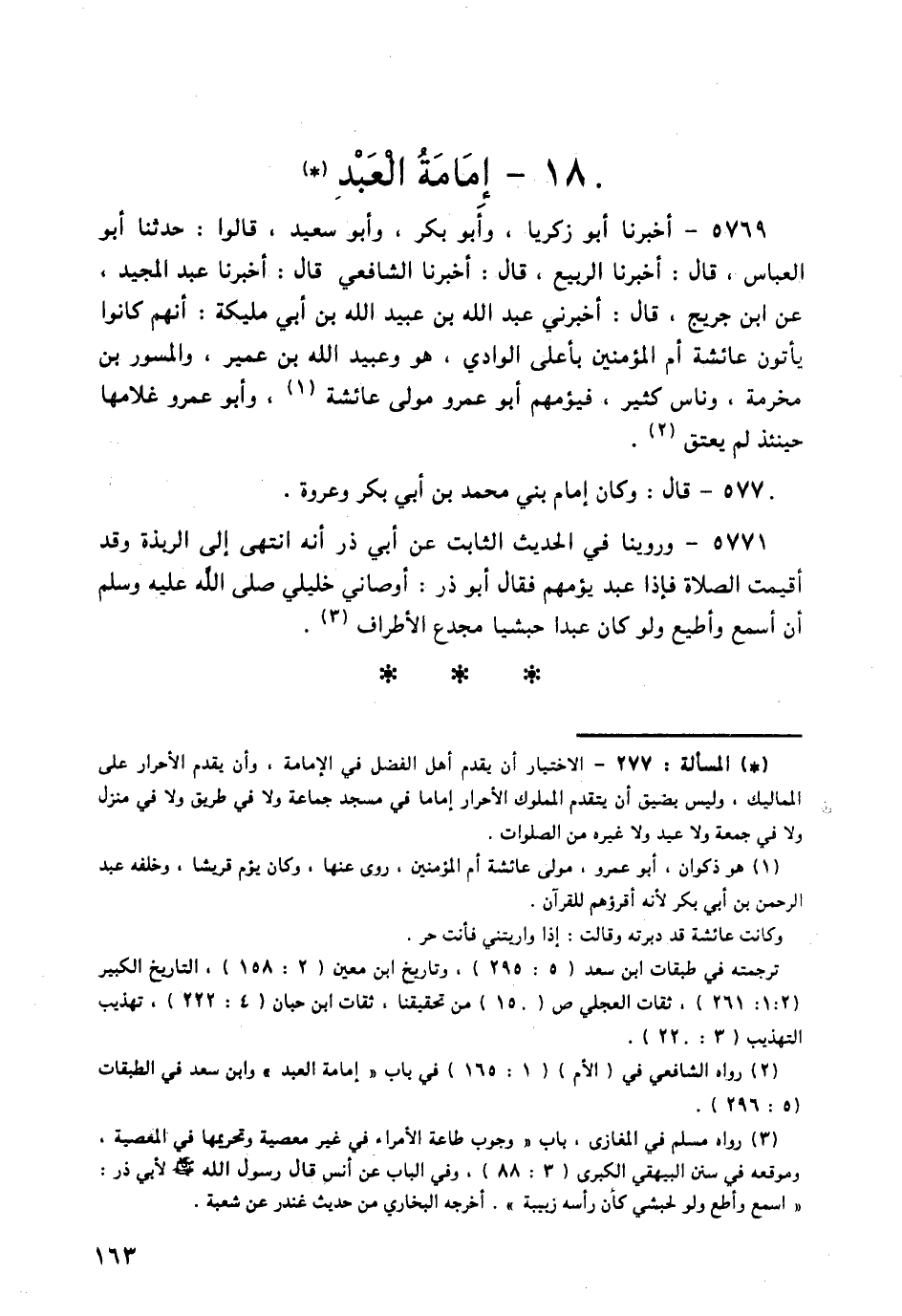 5769 - أَخْبَرَنَا أَبُو زَكَرِيَّا، وأَبُو بَكْرٍ، وَأَبُو سَعِيدٍ قَالُوا: حَدَّثَنَا أَبُو الْعَبَّاسِ قَالَ: أَخْبَرَنَا الرَّبِيعُ قَالَ: أَخْبَرَنَا الشَّافِعِيُّ قَالَ: أَخْبَرَنَا عَبْدُ الْمَجِيدِ، عَنِ ابْنِ جُرَيْجٍ قَالَ: أَخْبَرَنِي عَبْدُ اللَّهِ بْنُ عُبَيْدِ اللَّهِ بْنِ أَبِي مُلَيْكَةَ أَنَّهُمْ كَانُوا يَأْتُونَ عَائِشَةَ أُمَّ الْمُؤْمِنِينَ بِأَعْلَى الْوَادِي، هُوَ وَعُبَيْدُ اللَّهِ بْنُ عُمَيْرٍ، وَالْمِسْوَرُ بْنُ مَخْرَمَةَ وَنَاسٌ كَثِيرٌ، «§فَيَؤُمُّهُمْ أَبُو عَمْرٍو مَوْلَى عَائِشَةَ، وَأَبُو عَمْرٍو غُلَامُهَا حِينَئِذٍ لَمْ يُعْتَقْ»