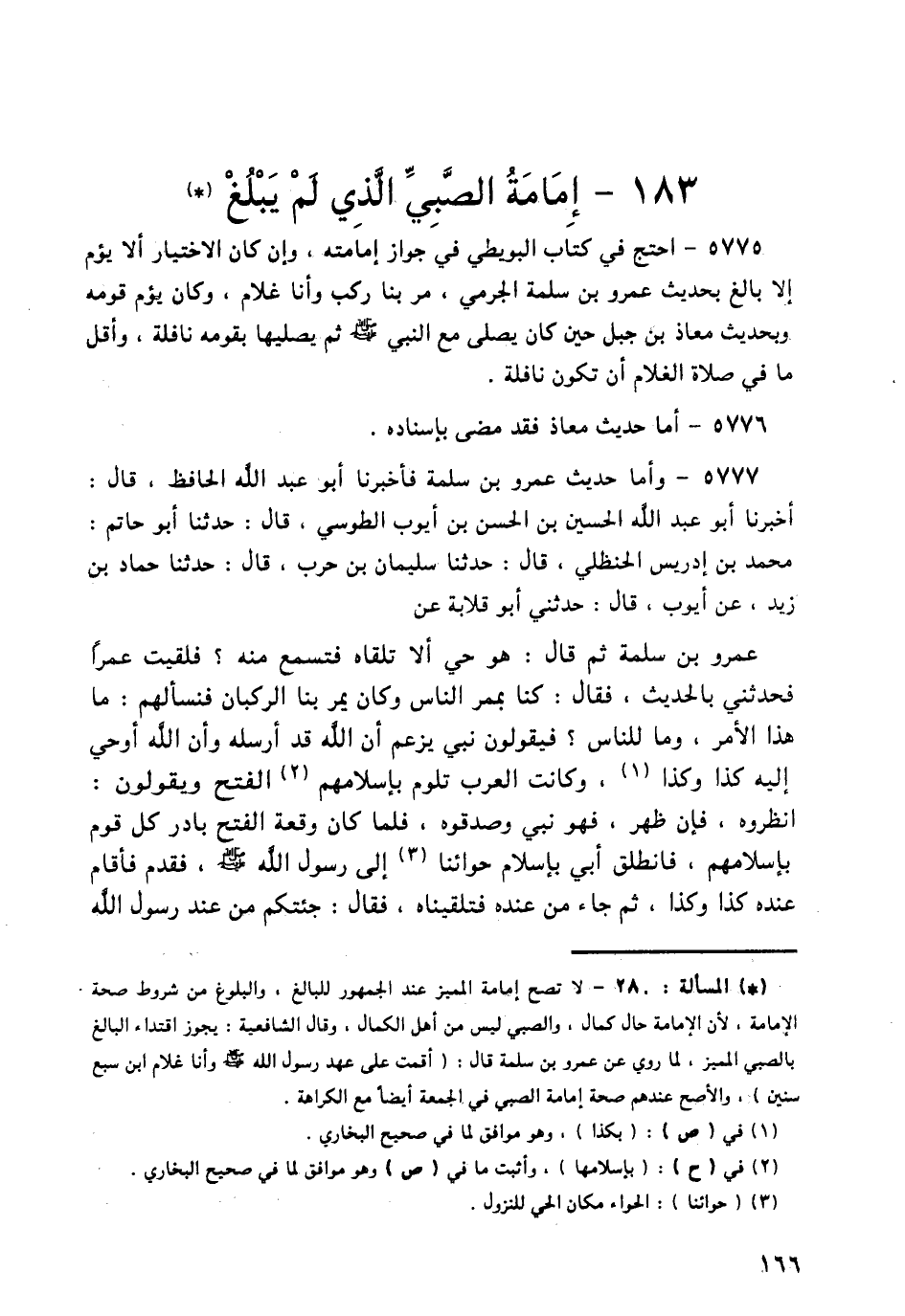 5775 - احْتَجَّ فِي كِتَابِ الْبُوَيْطِيِّ: فِي جَوَازِ إِمَامَتِهِ، وَإِنْ كَانَ الِاخْتِيَارُ أَلَّا يَؤُمَّ إِلَّا بَالِغٌ بِحَدِيثِ عَمْرِو بْنِ سَلَمَةَ الْجَرْمِيِّ، مَرَّ بِنَا رَكْبٌ وَأَنَا غُلَامٌ، وَكَانَ يَؤُمُّ قَوْمَهُ وَبِحَدِيثِ مُعَاذِ بْنِ جَبَلٍ حِينَ كَانَ يُصَلِّي مَعَ النَّبِيِّ صَلَّى اللهُ عَلَيْهِ وَسَلَّمَ، ثُمَّ يُصَلِّيهَا بِقَوْمِهِ نَافِلَةً، وَأَقَلُّ مَا فِي صَلَاةِ الْغُلَامِ أَنْ تَكُونَ نَافِلَةً.