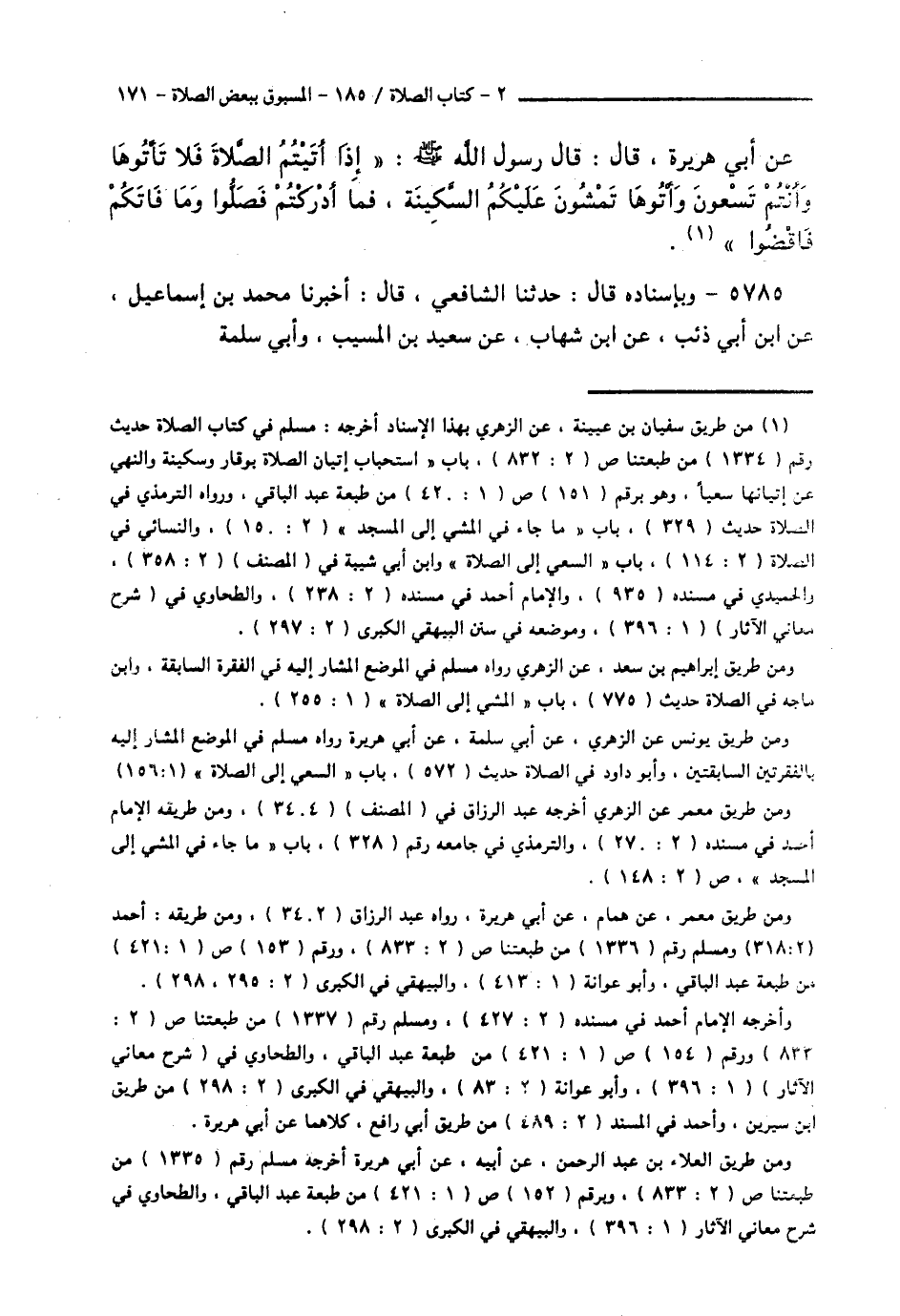 5785 - وَبِإِسْنَادِهِ قَالَ: حَدَّثَنَا الشَّافِعِيُّ قَالَ: أَخْبَرَنَا مُحَمَّدُ بْنُ إِسْمَاعِيلَ، عَنِ ابْنِ أَبِي ذِئْبٍ، عَنِ ابْنِ شِهَابٍ، عَنْ سَعِيدِ بْنِ الْمُسَيِّبِ، وَأَبِي سَلَمَةَ -[172]-، عَنْ أَبِي هُرَيْرَةَ، أَنَّ رَسُولَ اللَّهِ صَلَّى اللهُ عَلَيْهِ وَسَلَّمَ قَالَ: § «إِذَا سَمِعْتُمُ الْإِقَامَةَ فَامْشُوا وَعَلَيْكُمُ السَّكِينَةُ، فَمَا أَدْرَكْتُمْ فَصَلُّوا وَمَا فَاتَكُمْ فَأَتِمُّوا» حَدِيثُ سُفْيَانَ أَخْرَجَهُ مُسْلِمٌ، وَحَدِيثُ ابْنِ أَبِي ذِئْبٍ أَخْرَجَهُ الْبُخَارِيُّ فِي الصَّحِيحِ