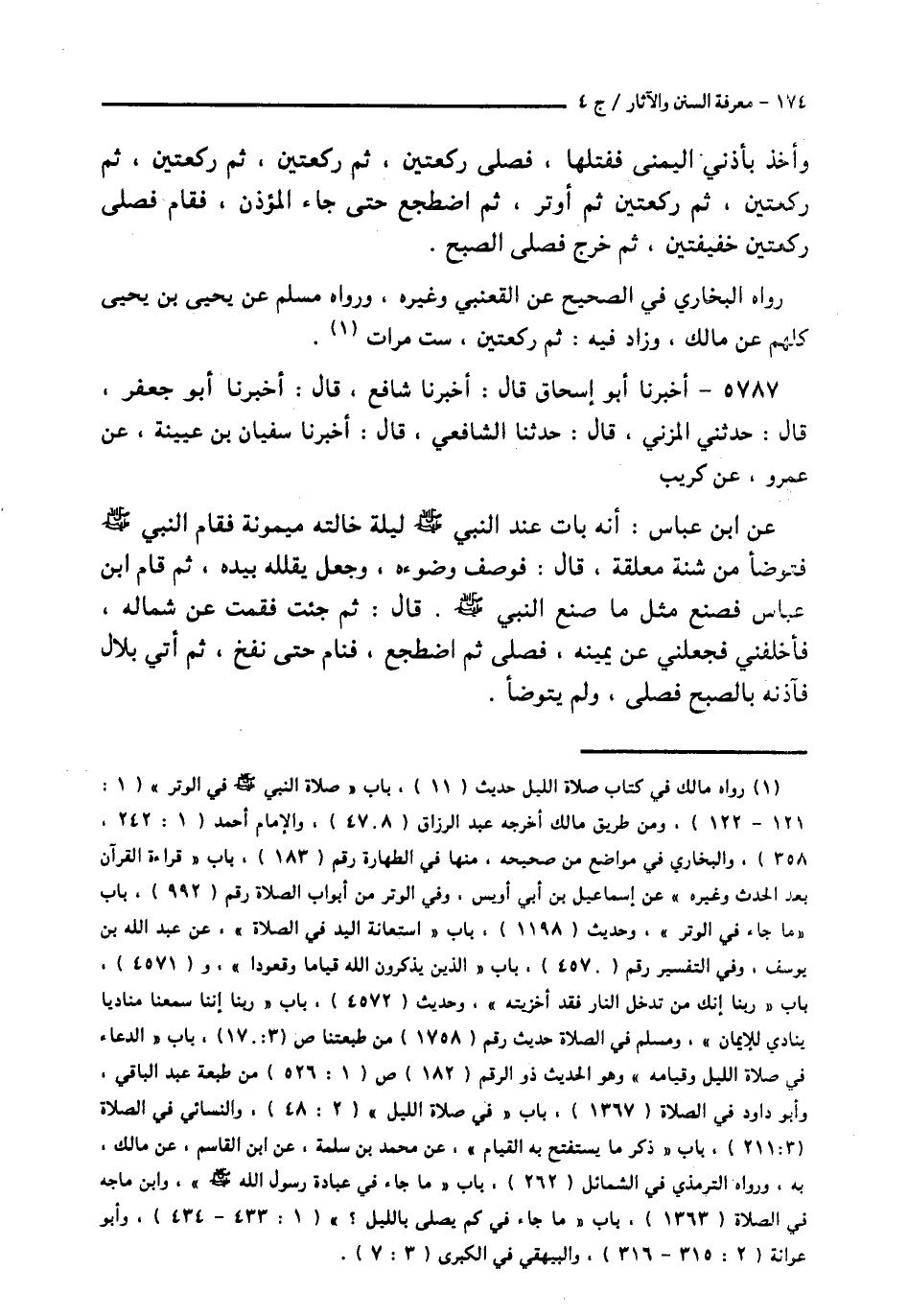 5787 - أَخْبَرَنَا أَبُو إِسْحَاقَ قَالَ: أَخْبَرَنَا شَافِعٌ قَالَ: أَخْبَرَنَا أَبُو جَعْفَرٍ قَالَ: حَدَّثَنِي الْمُزَنِيُّ قَالَ: حَدَّثَنَا الشَّافِعِيُّ قَالَ: أَخْبَرَنَا سُفْيَانُ بْنُ عُيَيْنَةَ، عَنْ عَمْرٍو، عَنْ كُرَيْبٍ، عَنِ ابْنِ عَبَّاسٍ، أَنَّهُ بَاتَ عِنْدَ النَّبِيِّ صَلَّى اللهُ عَلَيْهِ وَسَلَّمَ لَيْلَةَ خَالَتِهِ مَيْمُونَةَ §" فَقَامَ النَّبِيُّ صَلَّى اللهُ عَلَيْهِ وَسَلَّمَ فَتَوَضَّأَ مِنْ شَنَّةٍ مُعَلَّقَةٍ. قَالَ: فَوَصَفَ وُضُوءَهُ وَجَعَلَ يُقَلِّلُهُ بِيَدِهِ، ثُمَّ قَامَ ابْنُ عَبَّاسٍ فَصَنَعَ مِثْلَ ما صَنَعَ النَّبِيُّ صَلَّى اللهُ عَلَيْهِ وَسَلَّمَ قَالَ: ثُمَّ جِئْتُ فَقُمْتُ عَنْ شِمَالِهِ، فَأَخْلَفَنِي فَجَعَلَنِي عَنْ يَمِينِهِ، فَصَلَّى ثُمَّ اضْطَجَعَ، فَنَامَ حَتَّى نَفَخَ، ثُمَّ أَتَى بِلَالٌ فَآذَنَهُ بِالصُّبْحِ فَصَلَّى، وَلَمْ يَتَوَضَّأْ " -[175]-