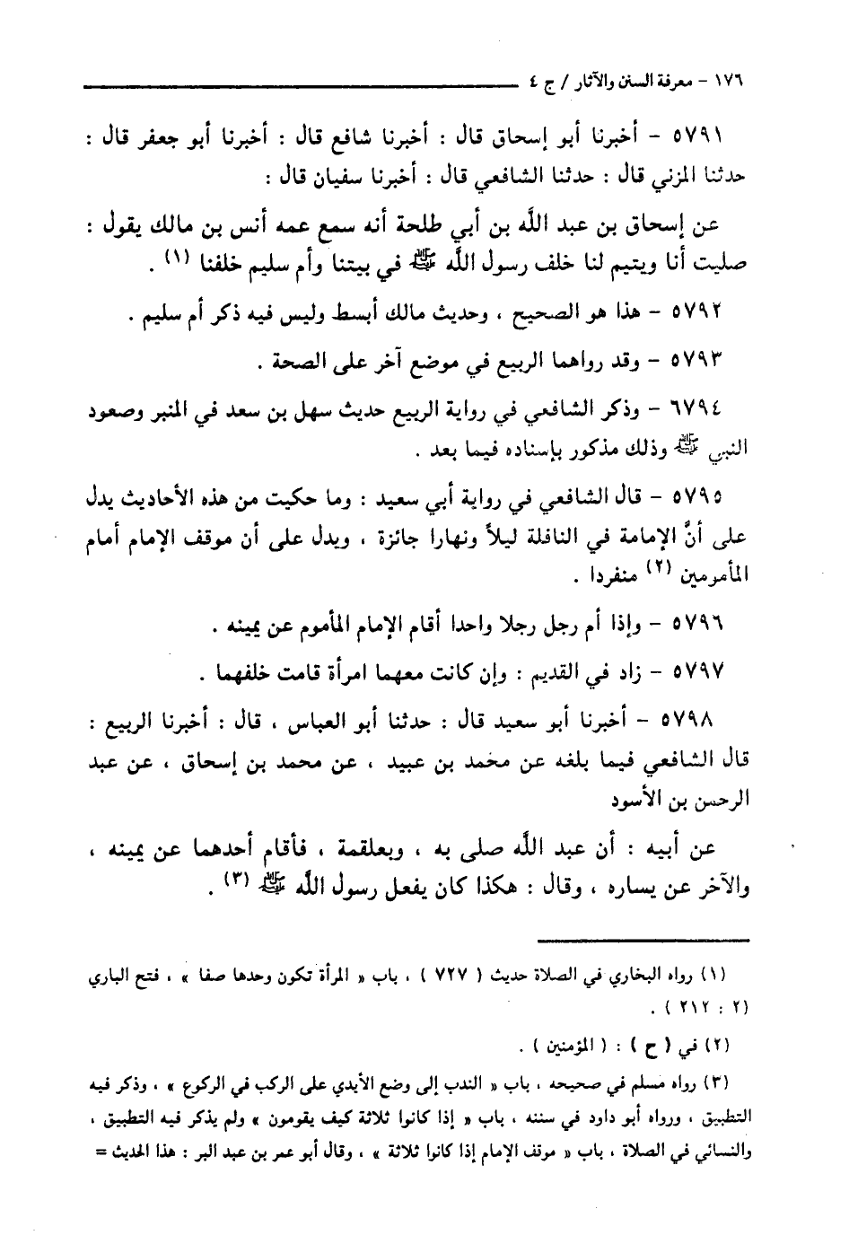 5791 - أَخْبَرَنَا أَبُو إِسْحَاقَ قَالَ: أَخْبَرَنَا شَافِعٌ قَالَ: أَخْبَرَنَا أَبُو جَعْفَرٍ قَالَ: حَدَّثَنَا الْمُزَنِيُّ قَالَ: حَدَّثَنَا الشَّافِعِيُّ قَالَ: أَخْبَرَنَا سُفْيَانُ قَالَ: عَنْ إِسْحَاقَ بْنِ عَبْدِ اللَّهِ بْنِ أَبِي طَلْحَةَ، أَنَّهُ سَمِعَ عَمَّهُ أَنَسَ بْنَ مَالِكٍ يَقُولُ: § «صَلَّيْتُ أَنَا وَيَتِيمٌ لَنَا خَلْفَ رَسُولِ اللَّهِ صَلَّى اللهُ عَلَيْهِ وَسَلَّمَ فِي بَيْتِنَا وَأُمُّ سُلَيْمٍ خَلْفَنَا»