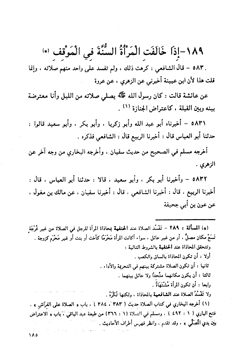 5830 - قَالَ الشَّافِعِيُّ: كَرِهْتُ ذَلِكَ، وَلَمْ تَفْسُدْ عَلَى وَاحِدٍ مِنْهُمْ صَلَاتُهُ، وَإِنَّمَا قُلْتُ هَذَا لِأَنَّ ابْنَ عُيَيْنَةَ أَخْبَرَنِي، عَنِ الزُّهْرِيِّ، عَنْ عُرْوَةَ، عَنْ عَائِشَةَ قَالَتْ: كَانَ رَسُولُ اللَّهِ صَلَّى اللهُ عَلَيْهِ وَسَلَّمَ «§يُصَلِّي صَلَاتَهُ مِنَ اللَّيْلِ وَأَنَا مُعْتَرِضَةٌ بَيْنَهُ وَبَيْنَ الْقِبْلَةِ، كَاعْتِرَاضِ الْجِنَازَةِ»