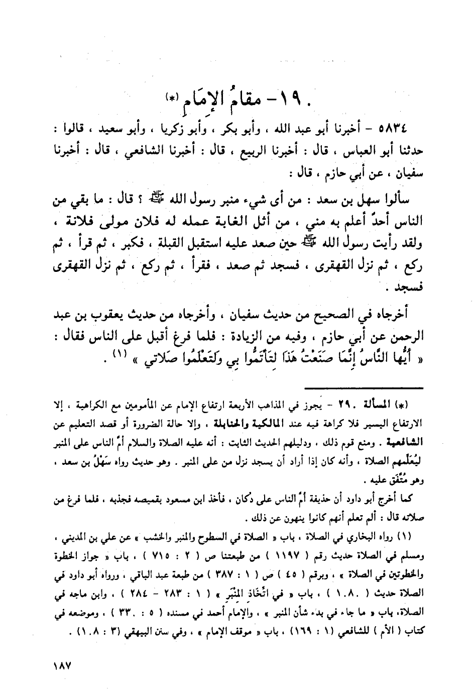 5834 - أَخْبَرَنَا أَبُو عَبْدِ اللَّهِ، وَأَبُو بَكْرٍ، وَأَبُو زَكَرِيَّا، وَأَبُو سَعِيدٍ قَالُوا: حَدَّثَنَا أَبُو الْعَبَّاسِ قَالَ: أَخْبَرَنَا الرَّبِيعُ قَالَ: أَخْبَرَنَا الشَّافِعِيُّ قَالَ: أَخْبَرَنَا سُفْيَانُ، عَنْ أَبِي حَازِمٍ قَالَ: سَأَلُوا سَهْلَ بْنَ سَعْدٍ: §" مِنْ أَيِّ شَيْءٍ مِنْبَرُ رَسُولِ اللَّهِ صَلَّى اللهُ عَلَيْهِ وَسَلَّمَ؟ قَالَ: مَا بَقِيَ مِنَ النَّاسِ أَحَدٌ أَعْلَمُ بِهِ مِنِّي، مِنْ أَثْلِ الْغَابَةِ عَمِلَهُ لَهُ فُلَانٌ مَوْلَى فُلَانَةَ، وَلَقَدْ رَأَيْتُ رَسُولَ اللَّهِ صَلَّى اللهُ عَلَيْهِ وَسَلَّمَ حِينَ صَعِدَ عَلَيْهِ اسْتَقْبَلَ الْقِبْلَةَ فَكَبَّرَ، ثُمَّ قَرَأَ، ثُمَّ رَكَعَ، ثُمَّ نَزَلَ الْقَهْقَرَى، فَسَجَدَ ثُمَّ صَعِدَ، فَقَرَأَ ثُمَّ رَكَعَ، ثُمَّ نَزَلَ الْقَهْقَرَى فَسَجَدَ " أَخْرَجَاهُ فِي الصَّحِيحِ مِنْ حَدِيثِ سُفْيَانَ، وَأَخْرَجَاهُ مِنْ حَدِيثِ يَعْقُوبَ بْنِ عَبْدِ الرَّحْمَنِ، عَنْ أَبِي حَازِمٍ وَفِيهِ مِنَ الزِّيَادَةِ: " فَلَمَّا فَرَغَ أَقْبَلَ عَلَى النَّاسِ فَقَالَ: «أَيُّهَا النَّاسُ إِنَّمَا صَنَعْتُ هَذَا لِتَأْتَمُّوا بِي وَلِتَعْلَمُوا صَلَاتِي»